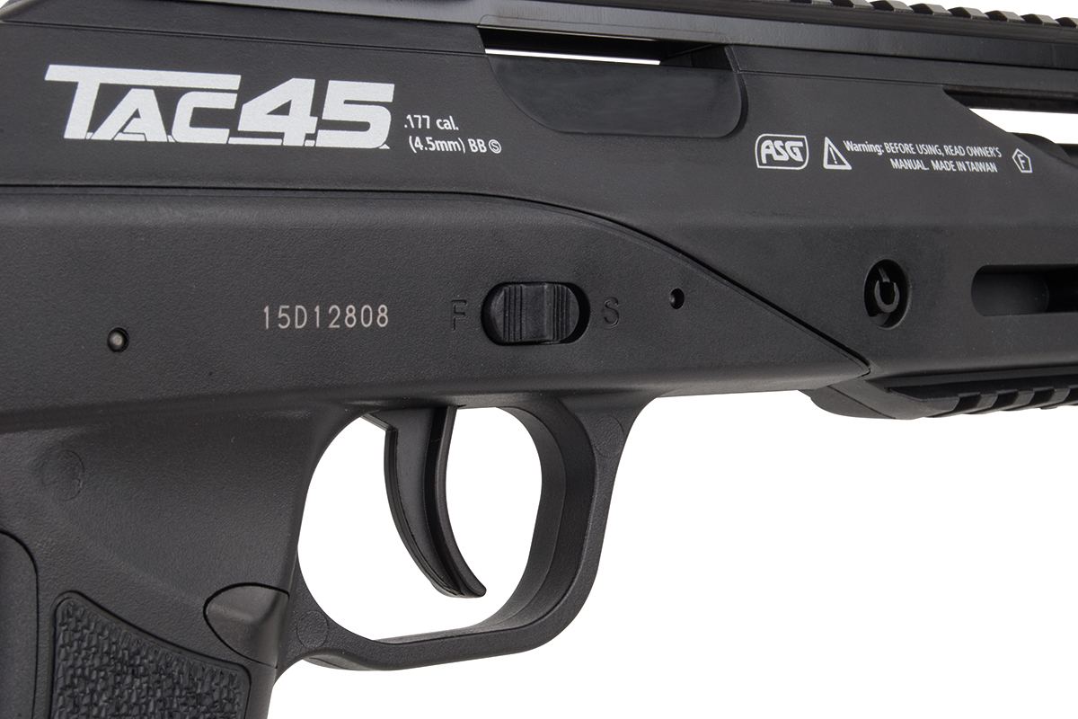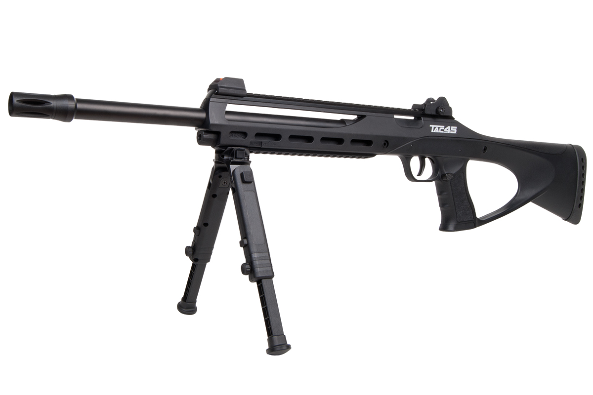 Das TAC 4.5 ist ein 21-schüssiges Luftgewehr mit einem hochwertigem Polymer-Body und einem Metall-Außenlauf im Sniper-Design. Das taktische Design ermöglicht dem Schützen eine Vielzahl an Variationsmöglichkeiten. Der ergonomische Lochschaft ist für Rechts- sowie Linksschützen geeignet. Durch das 21-Schuss Magazin ist ein langer Schießspaß vorprogrammiert. Das Model verfügt über zwei lange Railschienen, eine ventilierte Schaftkappe sowie eine abnehmbare Visierung. Die hintere Visierung ist zusätzlich einstellbar, vorne befindet sich ein Leuchtkorn. Ein einstellbares, klappbares Zweibein ist im Lieferumfang enthalten.