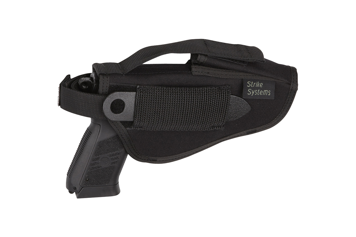 Das schwarze Gürtelholster aus dem Hause ASG verfügt über eine zusätzliche Magazintasche und ist für Rechts- sowie Linkshänder geeignet. Die Waffe wird durch zwei einstellbare Sicherungsgurte gesichert (per Druckkopf und Klettverschluss). Es eigent sich u.a. für die Modelle M92, G17, G18, STI, CZ und Steyr.