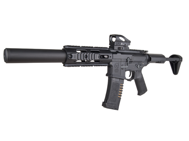 Die hochwertig verarbeitete S-AEG Waffe aus dem Hause ARES wird aus Nylon Fiber gefertigt. Der Vorderschaft besteht aus Metall. Sie verfügt über einen Schiebeschaft, eine Flip-Up Visierung, zwei Railschienen, einen Vorderschaft mit Handstopp, ein Schnellwechselmagazin und ein einstellbares Spin-Up System.