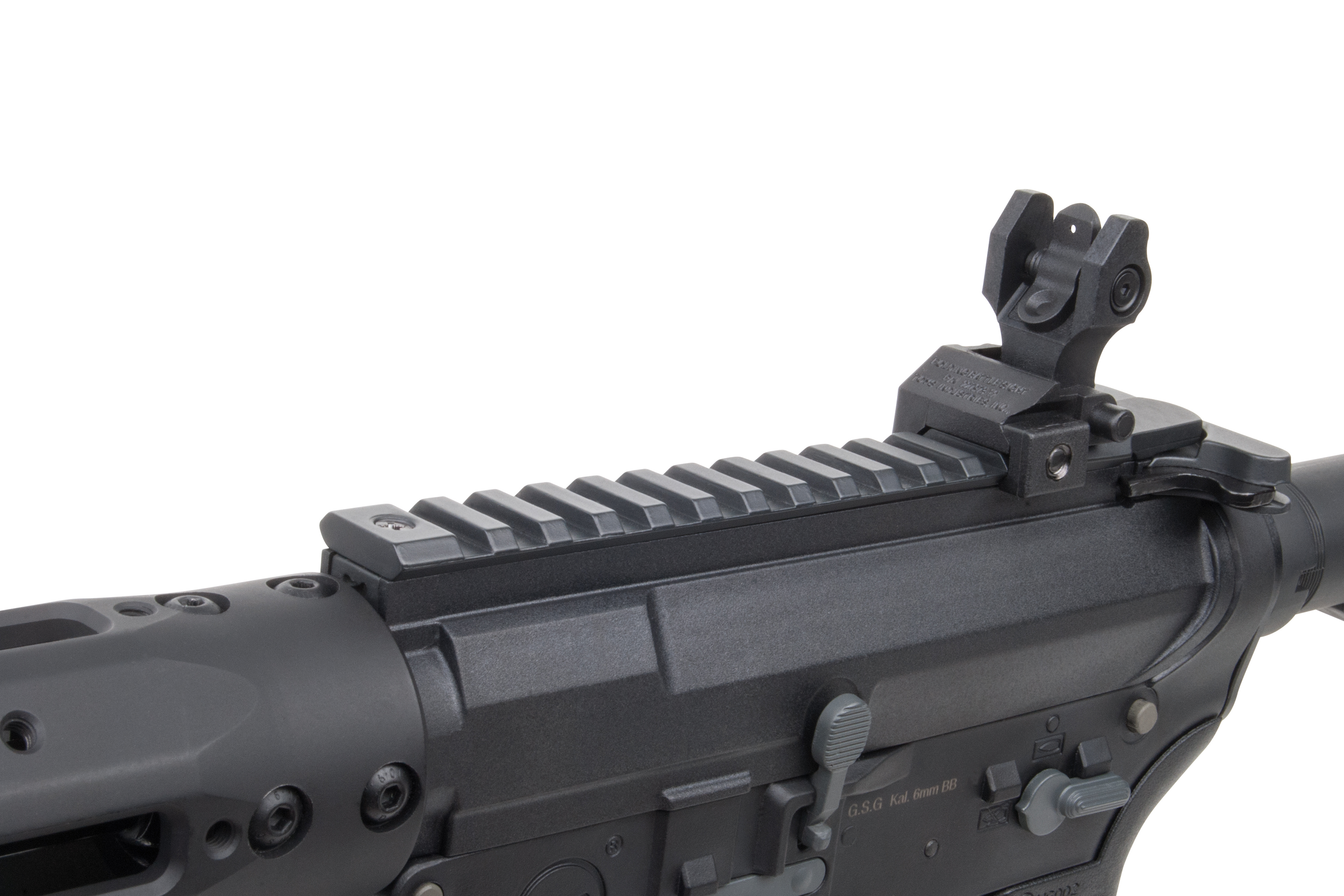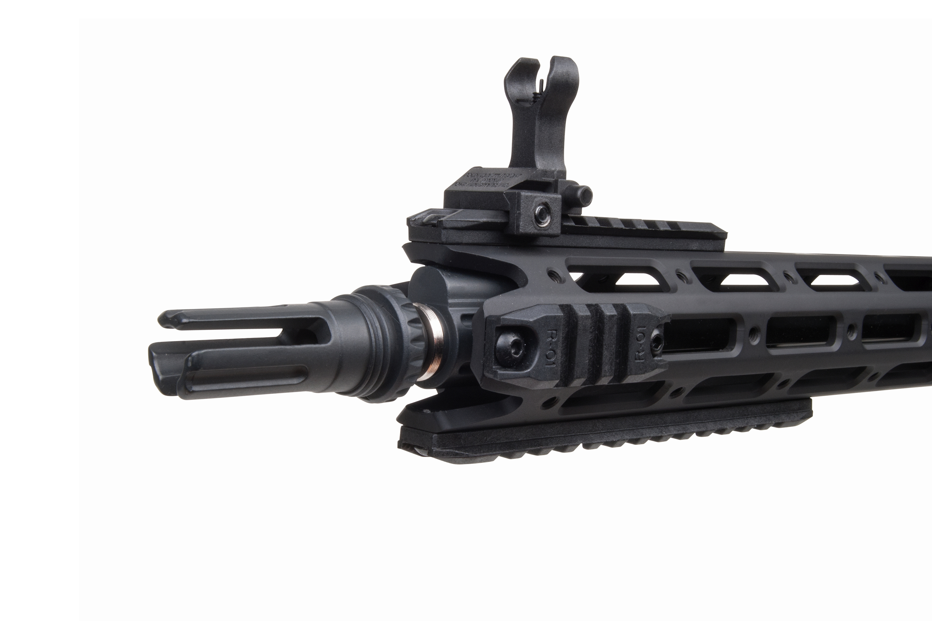 Die hochwertige AEG stammt aus der Combat Gear Serie von Ares und wird schlagfestem Nylon Kunststoff gefertigt. Der Außenlauf ist aus Aluminium und mit einem Scar-Type Aluminium Flash Hider versehen. Der abnehmbare Flash Hider wird mit einem 13,5 mm Rechtsgewinde befestigt.Die M4 009 bietet dir außerdem ein 300 mm R.A.S.-Schienensystem. Dank der vielen Bohrungen kannst du die enthaltenen 21 mm Railschienen beliebig anbringen. Auch auf der Unterseite befindet sich eine Railschiene. Der taktische Griff mit Riffelung und die Schaftbacke (6-fach ausziehbar) sorgen für Komfort. Genaues Zielen gelingt dir mit Hilfe des einstellbaren Spin-Ups und Visierung. Die Visierung kann bei Bedarf auch ganz abgenommen werden.
