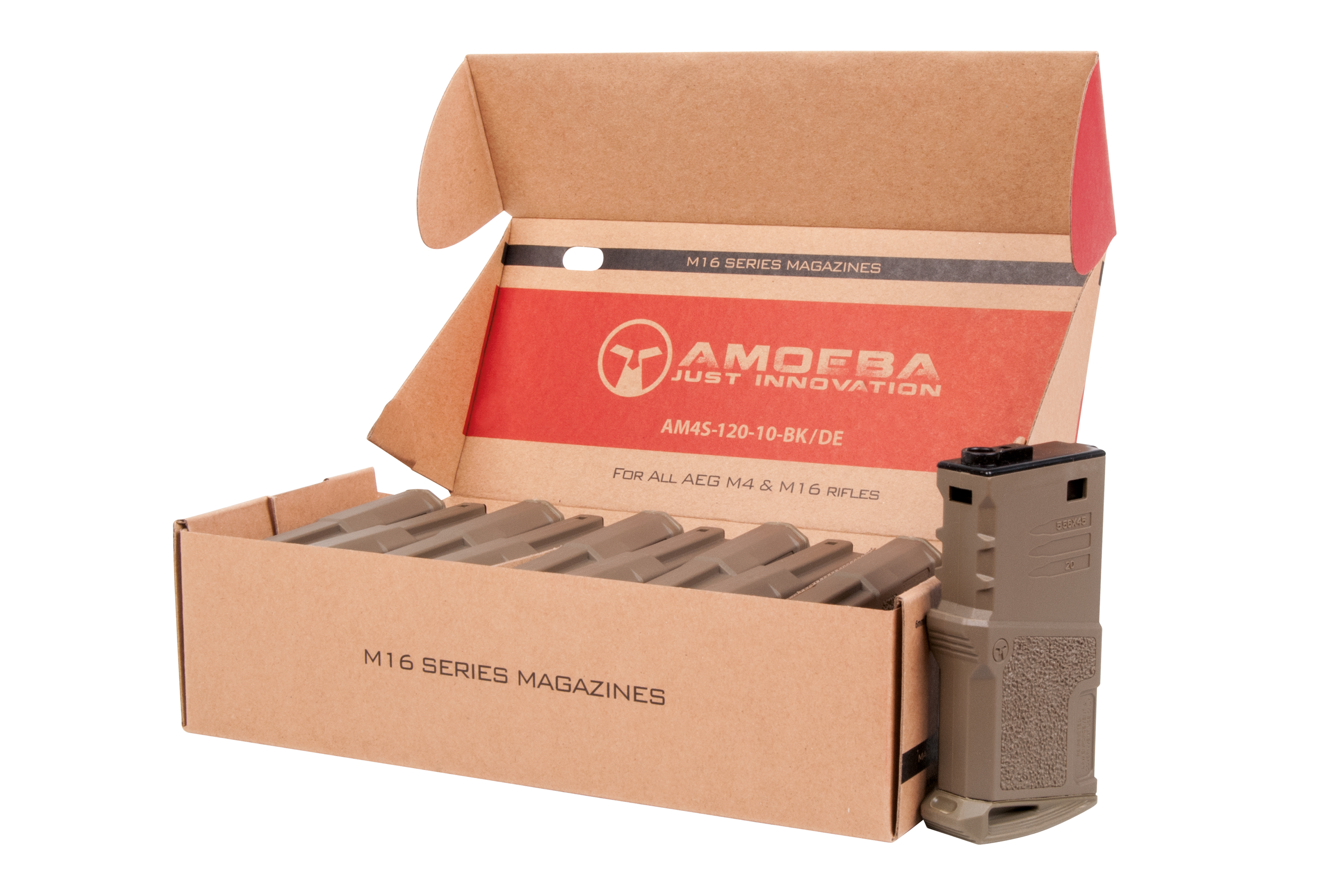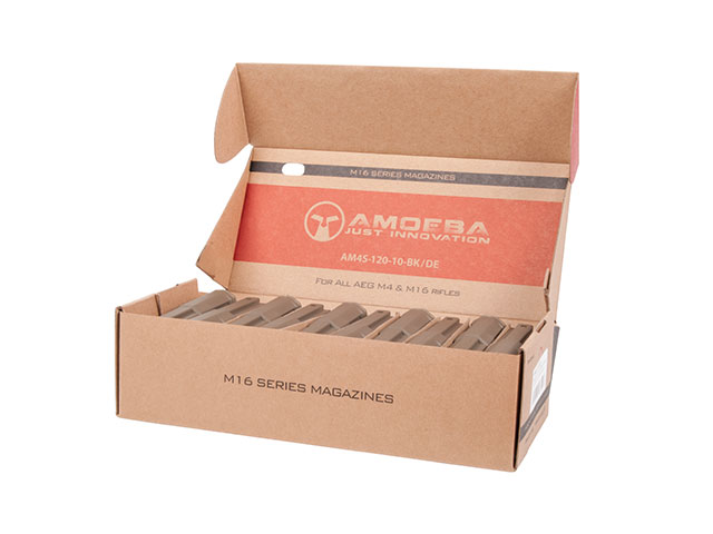 10er Pack Mid Cap Magazine in der Farbe Dark Earth von Ares Airsoft für fast alle M4 und M16 Softair Waffen (S-AEG), die Tokyo Marui kompatibel sind, wie z.B. die von Ares Amoeba, VFC und G&G. Das Airsoft Magazin ist aus schlagfestem und strapazierfähigem Kunststoff hergestellt, wodurch es besonders leicht wird. Dank des taktischen Designs und der rauen Oberfläche ist ein sicheres Magazinwechseln garantiert. Authentische Beschriftungen runden das Gesamtbild ab.