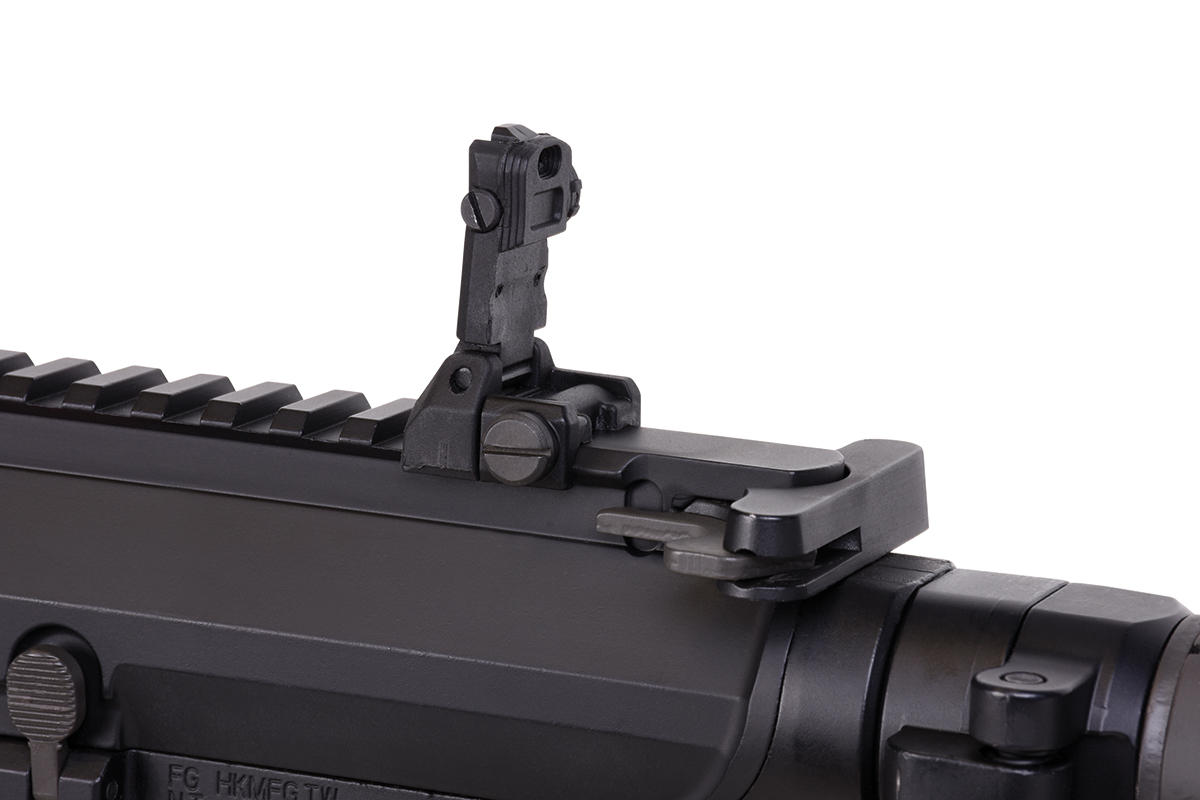 Kimme und Korn sind als Flip-Up-Visierungen ausgeführt. Das einstellbare Spin-Up System befindet sich direkt unter dem Hülsenauswurffenster und lässt sich schnell justieren. Ein R.A.S.-Vorderschaft, eine Railschiene, eine beidhändig bedienbare Sicherung sowie ein gerader Abzugszüngel runden die Ausstattung der Softair Waffe ab.