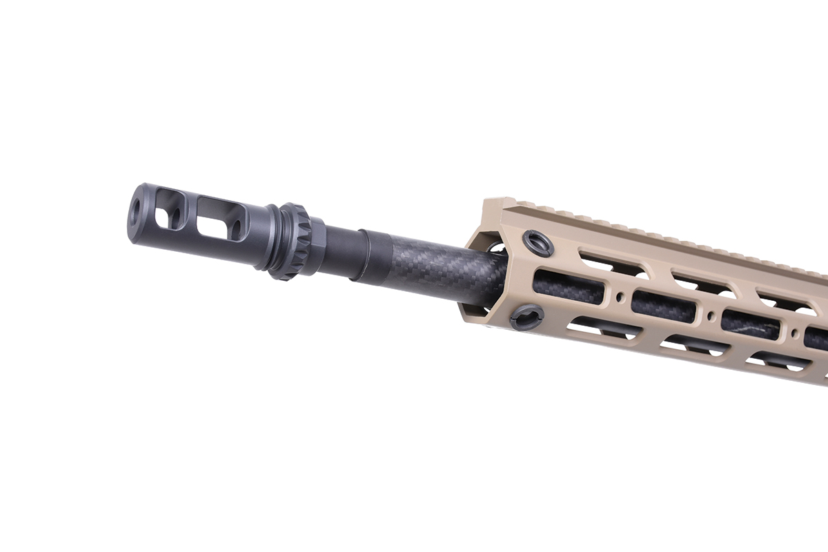 Das Gehäuse der Softair Waffe besteht aus einer hochwertigen Kombination aus Aluminium und Polymer, was eine optimale Balance aus Stabilität und Gewicht bietet. Der Außenlauf in Carbon-Optik verleiht dem Softairgewehr nicht nur ein modernes Erscheinungsbild, sondern trägt auch zur Gewichtsreduktion bei. Ein Mündungsfeuerdämpfer rundet das taktische Design ab.