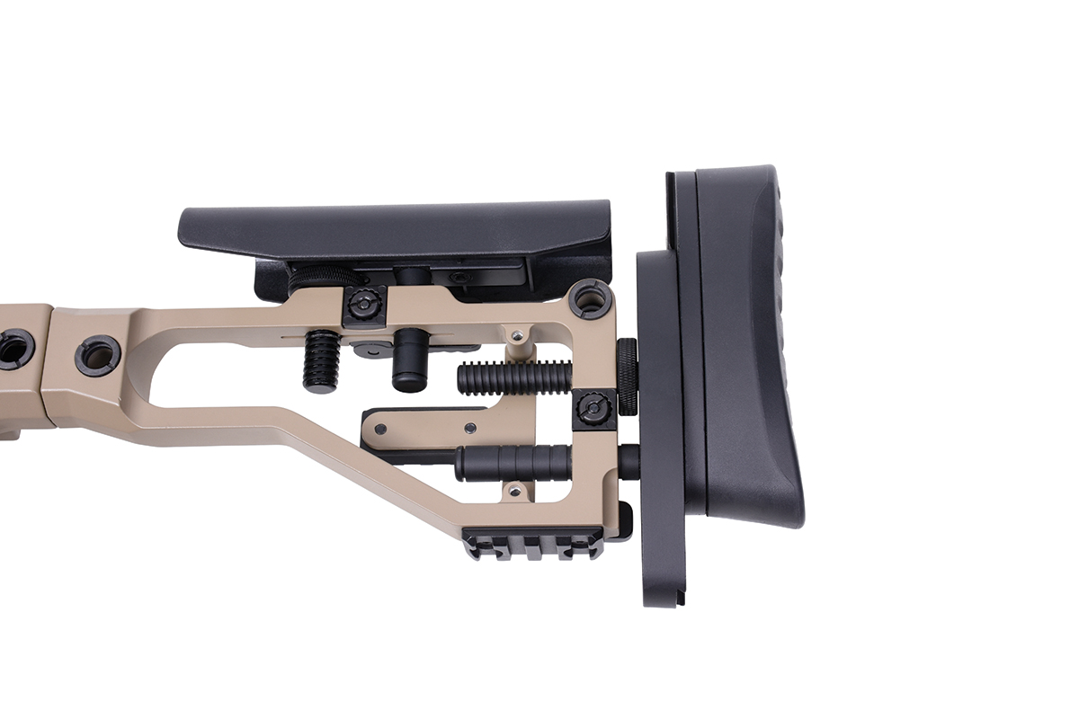 Das Gehäuse der MSR-303 besteht aus hochwertigem Aluminium und Polymer, wodurch es eine ausgewogene Kombination aus Robustheit und leichtem Gewicht bietet. Das Gewehr ist präzise gefertigt und bietet eine hervorragende Passform und Verarbeitung. Der Außenlauf ist aus Carbon gefertigt und besitzt einen Mündungsfeuerdämpfer. Die Schaftkappe des Sniper Gewehrs ist in der Höhe und Länge verstellbar. Die Schaftbacken kannst du in der Höhe verstellen und so genau an deine Bedürfnisse anpassen. Am M-Lok Vorderschaft kannst du Zubehör, wie einen Frontgriff oder ein Zweibein montieren. Eine lange Picatinnyschiene bietet dir die Möglichkeit, ein Zielfernrohr oder ein Red Dot zu verwenden.