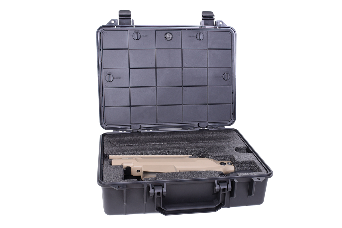 Die Bauweise der Bolt Action Waffe ist gut durchdacht. Unter dem Klappschaft findest du eine kleine Railschiene, an der man eine zusätzliche Stütze anbringen kann. Der Pistolengriff ist ergonomisch geformt und gewährleistet so ein besseres Handling des Gewehrs. Alle Bedienteile sind gut für den Schützen erreichbar. Die Airsoft Waffe ist mit wenigen Handgriffen und ohne Werkzeug zerlegbar und kann in dem mitgelieferten Waffenkoffer sicher transportiert werden.