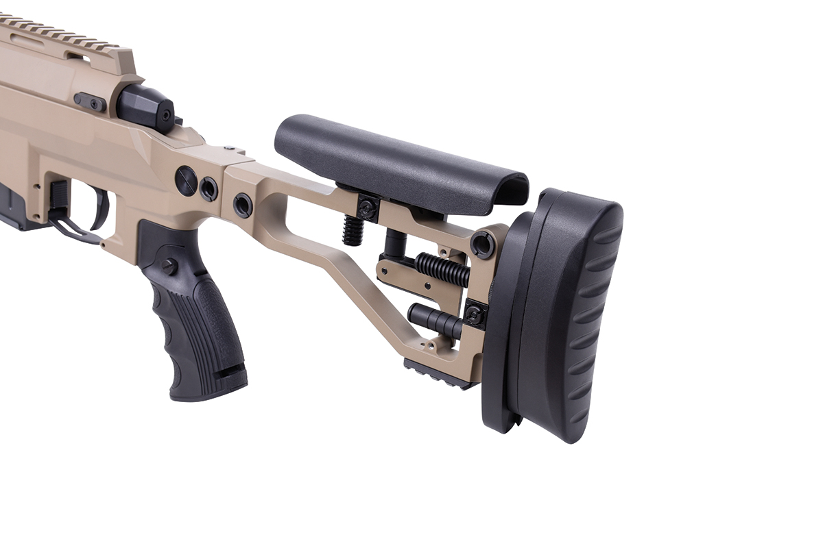 Das MSR-303 Softair Gewehr überzeugt durch eine durchdachte Ergonomie. Die Schaftbacke ist höhenverstellbar, während sich die Schaftkappe sowohl in der Höhe als auch in der Länge anpassen lässt. Dadurch kannst du das Gewehr exakt auf deine Körperhaltung und Schießposition abstimmen.