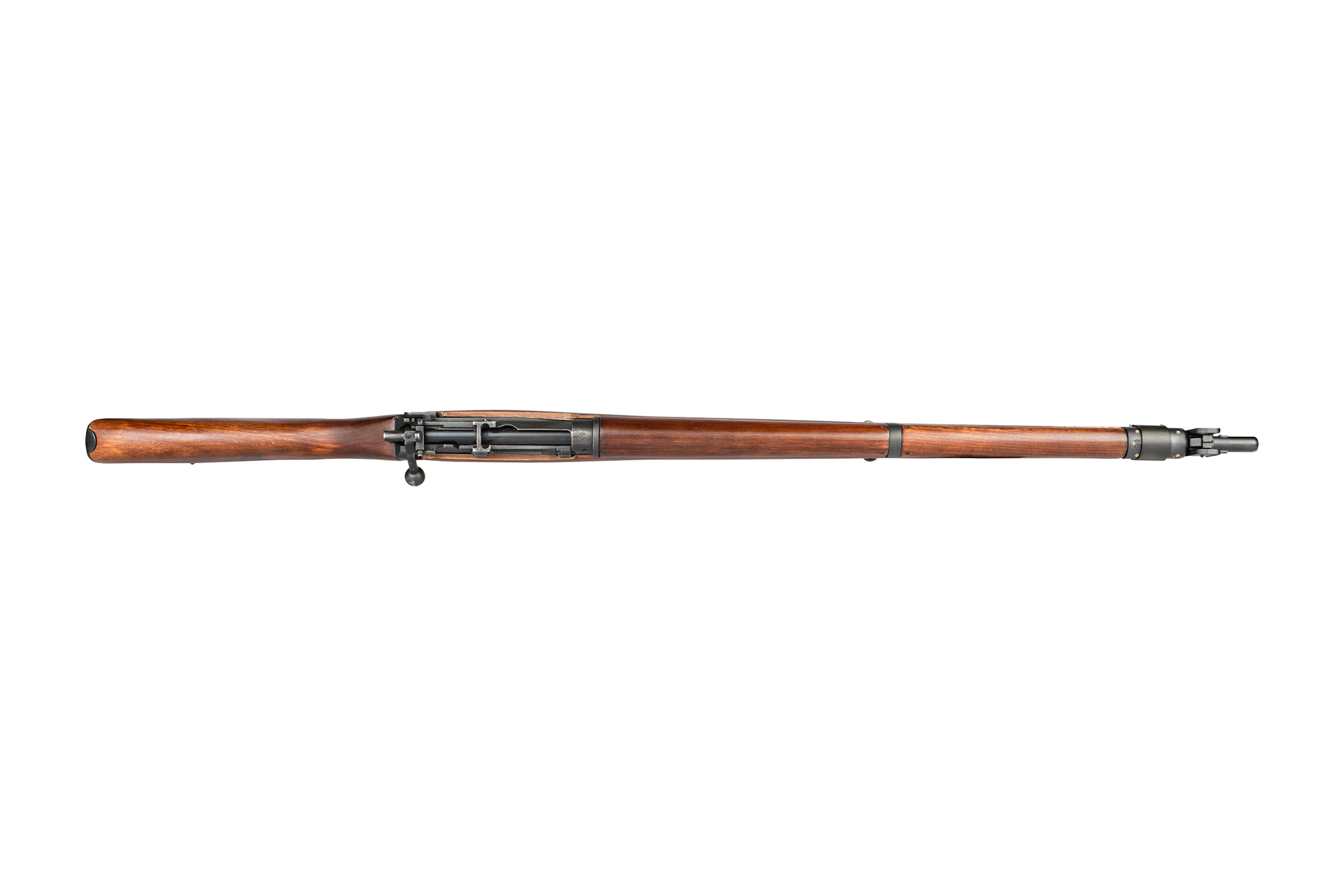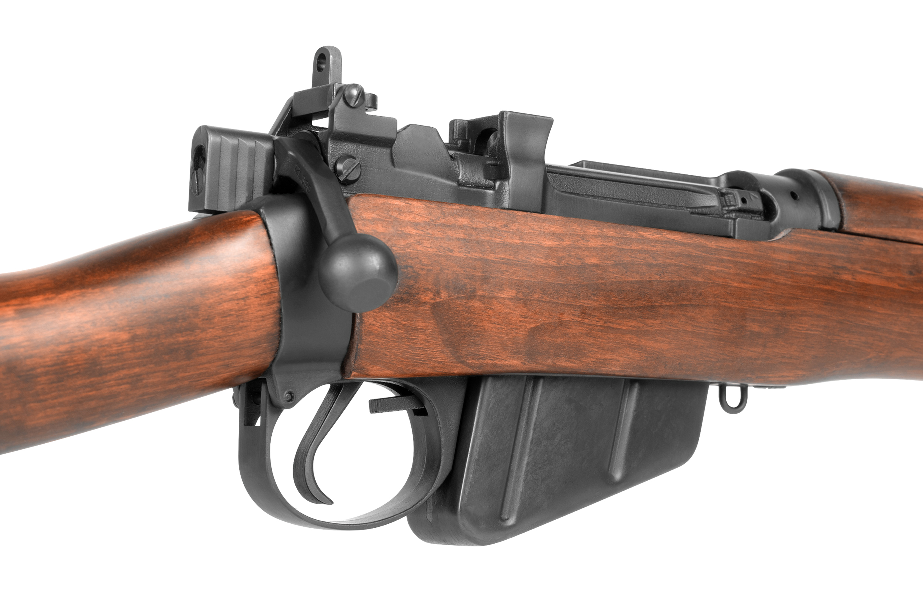 Das legendäre Lee Enfield Gewehr ist ein britisches Repetiergewehr, das seit über 100 Jahren in verschiedensten Varianten von der britischen Armee und Polizeibehörden verwendet wird. Die Variante Nr. 4 MK1 wurde zu Beginn des Zweiten Weltkriegs im Jahr 1941 eingeführt, da sie im Vergleich zu den vorherigen SMLE-Varianten (Short Magazine, Lee Enfield) effizienter und einfacher in Serie zu produzieren war. Das SMLE Gewehr gilt als eines der besten Scharfschützengewehre des Zweiten Weltkriegs, da es moderne Features wie eine Wangenauflage, ein zentral montiertes Zielfernrohr kombiniert und damit eine hervorragende Treffsicherheit auf Kampfentfernung garantiert.