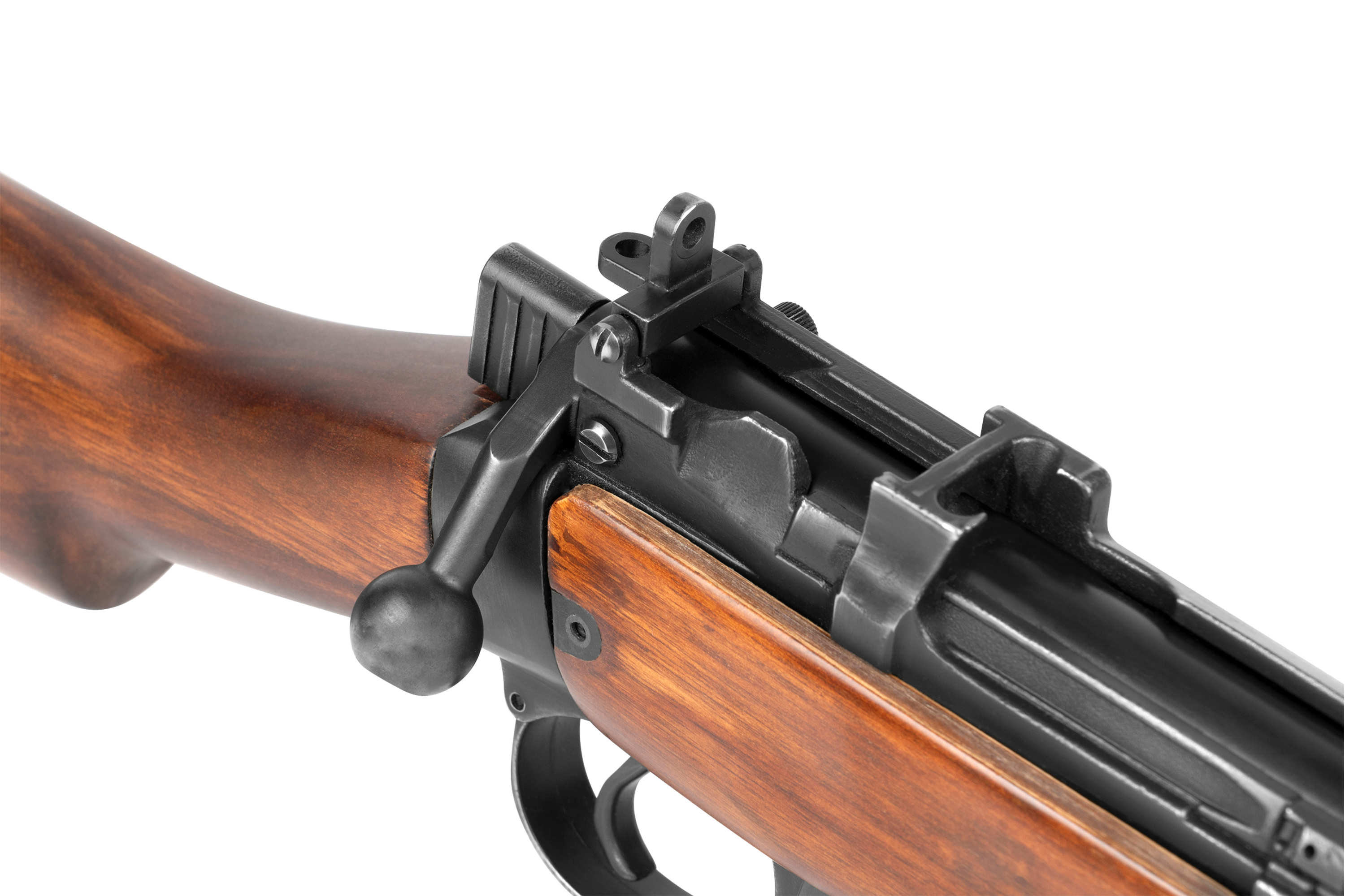 Die Repetierbüchse gibt es daher jetzt auch in der Airsoft Variante im Kaliber 6mm BB. Es handelt sich um einen 1:1 Nachbau des britischen SMLE Nr.4 MK1 Stahlgewehrs. Bei dieser Airsoft Waffe sind außerdem 95% der Teile aus Edelstahl mit QPQ Finish gefertigt. Der Softair Nachbau kommt mit einem besonders hochwertigen Echtholz Gewehrschaft. Das Finish des Holzschaftes und der Metallteile entspricht nahezu perfekt dem echten Gewehr, mit einer tiefen und abwechslungsreichen Holzmaserung auf dem Gewehr und einem glatten Gunmetal Finish auf den Metallteilen.