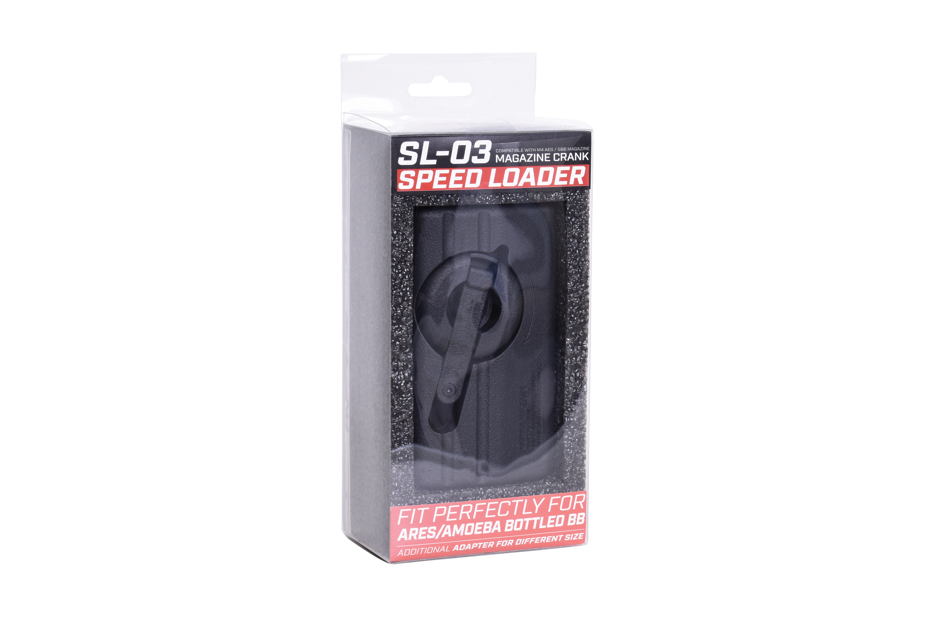 Der Ares Speedloader für alle Ares und Amoeba M4 Magazine befördert mit jeder Drehung der Kurbel 10 BBs in das Magazin und macht den Ladevorgang dadurch schnell und komfortabel. Er ist perfekt auf die Amoeba Premium (Bio) BB Flasche abgestimmt, ist aber durch den beiliegenden Adapter ebenfalls mit vielen anderen BB Flaschen kompatibel.