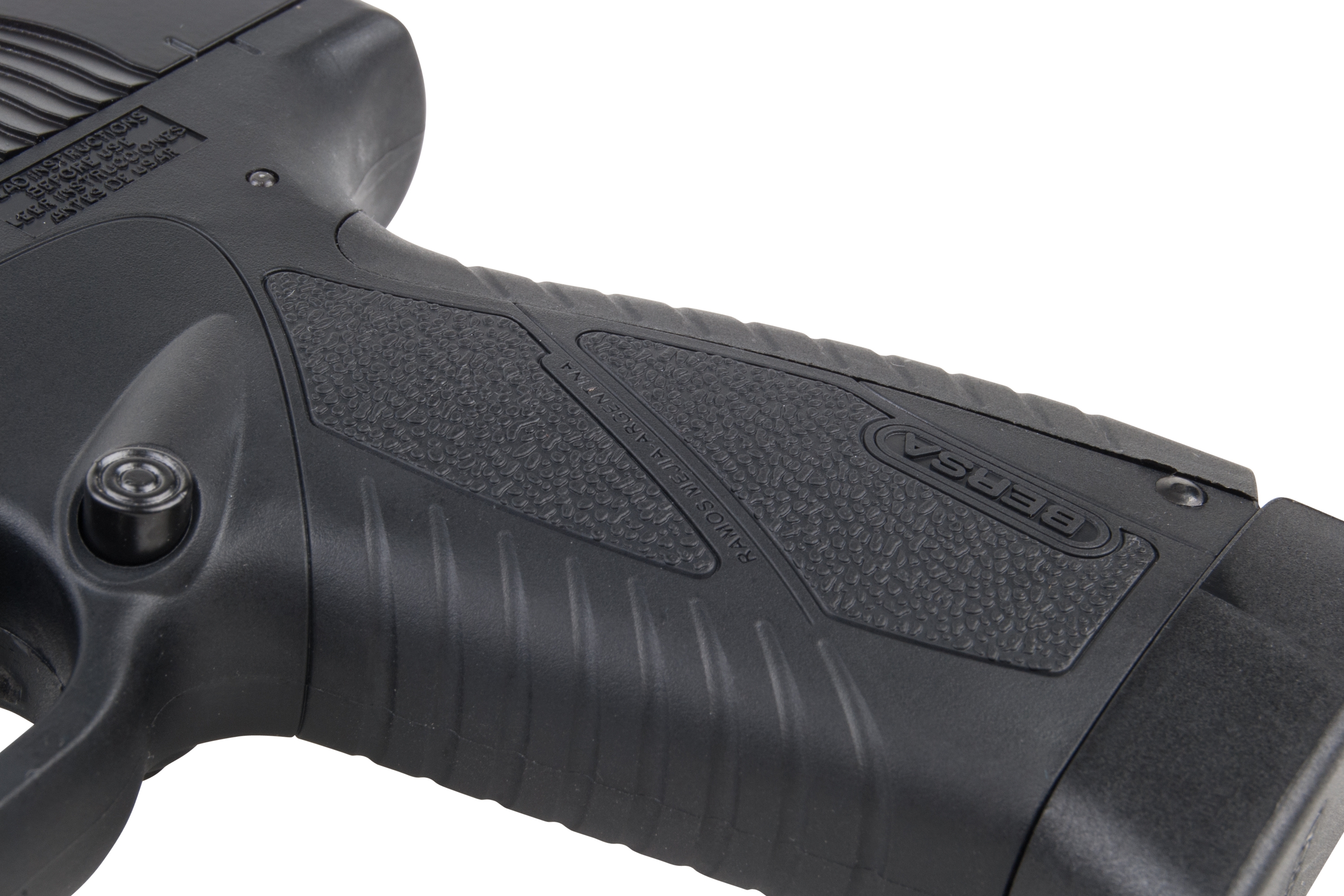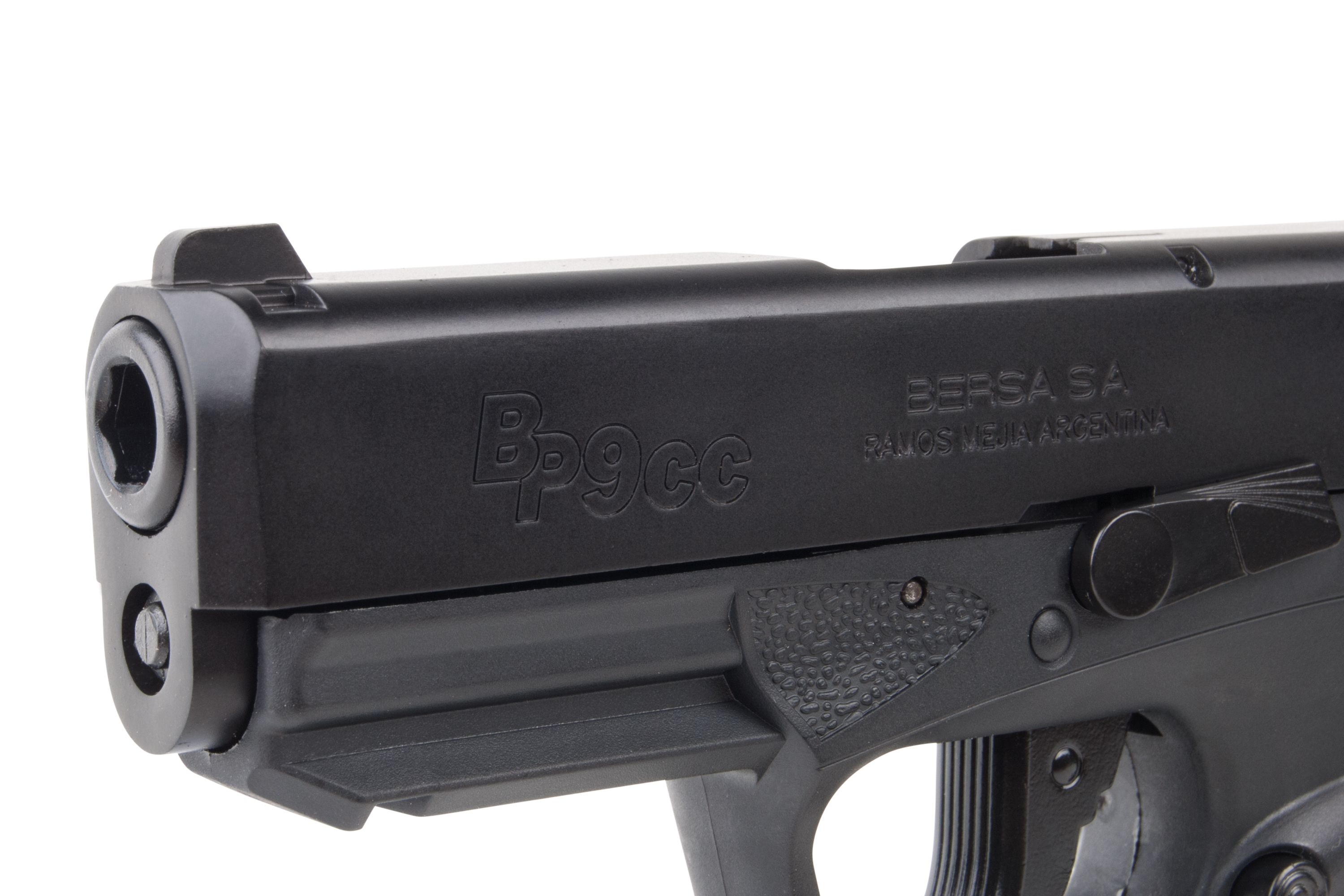 Dieser Nachbau der Bersa BP9CC ist eine Co2 Luftpistole im Kaliber 4,5. Da es sich hier um einen lizenzgerechten Waffennachbau handelt, ist die Bersa BP9CC mit Original Markings und dem Bersa Logo versehen. Außerdem ist auch eine fortlaufende Seriennummer in das Griffstück eingelassen. Ein Metallschlitten und ein Griffstück aus hochfestem Polymer verleihen der Druckluftpistole ein authentisches Gewicht. Trotz ihres schmalen Designs liegt die Co2-Pistole sehr gut in der Hand.