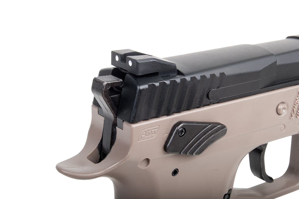 Die Druckluftpistole von ASG ist eine Co2 Waffe im Kaliber 4,5mm Diabolo. Es handelt sich um eine Waffe ab 18. Der Antrieb erfolgt über Co2 12g Patrone, von denen eine im Magazin untergebracht ist. Wie auch die echte Waffe, bietet dir dieses Modell einen authentischen Rückstoß, der durch das Co2 Blow Back System erzeugt wird. Diese Luftdruck Waffe ist mit den originalgetreuen CZ Markierungen versehen und ist nach lizenzrechtlichen Anforderungen gefertigt. Die solide Vollmetall Pistole ist im Maßstab 1:1 bietet für einen sicheren Halt auch einen rutschfesten Griff.