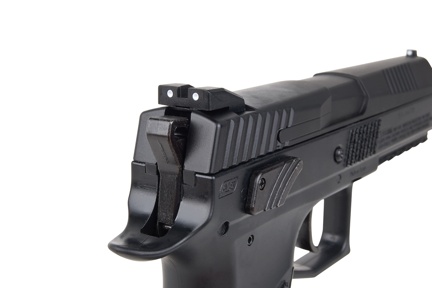 Das Zielen erfolgt über eine 3 Punkt Visierung mit Kimme und Korn. Kimme und Korn einstellen ist allerdings nicht möglich. Die Sicherung der Druckluftpistole ist beidseitig angebracht, damit ist die Waffe Linkshänder und Rechtshänder geeignet. Der gezogene Lauf aus Metall sorgt für eine ausgezeichnete Schusspräzision, während die Leistung von etwa 2,3 Joule optimal ist. Der Abzug ist ein Double Action Abzug.