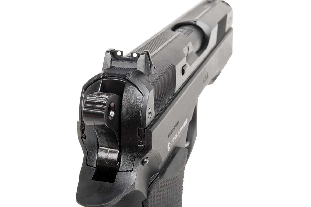 Anders als bei den meisten Co2-Waffen, verzichtet ASG bei dieser CO2 Pistole bewusst auf das BlowBack System. Dies ist nicht nur schonender für die Waffe und macht sie langlebiger, sondern ermöglicht es dir auch durch weniger Co2 Verlust deutlich mehr Schuss abzugeben. Insgesamt zählt die Waffe mit ca. 2,7 Joule als starke Luftpistole. Für das Zielen ist klassisch eine 3 Punkt Visierung aus Kimme und Korn aufgesetzt. Kimme und Korn einstellen ist hier nicht möglich. Der Abzug ist ein Double Action Abzug und schön leichtgängig. Die Sicherung ist an der linken Seite der Waffe angebracht.