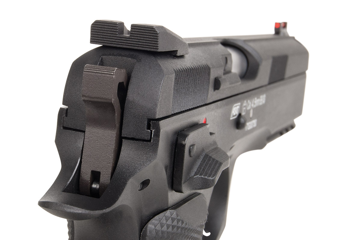 Die Luftdruckwaffe weist fast alle Features aus wie die echte Pistole. Die Demontage des Schlittens, der Schlittenfang und die beidseitig bedienbare Abzugssicherung sind voll funktionsfähig. Die Sicherung kann nur im gespannten Zustand eingelegt werden. Da sie beidseitig angebracht ist, eignet sich die Waffe für Linkshänder und Rechtshänder. Die CZ SP01 Shadow ist mit einem griffigen, gummierten Griffstück ausgestattet, das dank seiner angerauten Oberflächen und den eingearbeiteten CZ Markings einen sicheren Halt in jeder Situation gewährleistet. Der Metall Lauf sorgt für eine ausgezeichnete Schusspräzision, während die Leistung von etwa 1,6 Joule optimal ist. Die Visierung erfolgt über Kimme und Korn. Das vordere Fiber Optik Visier in der auffälligen roten Farbe erleichtert das Zielen und erhöht die Treffsicherheit. Bei dem Abzug handelt es sich um einen Single Action / Double Action Abzug.