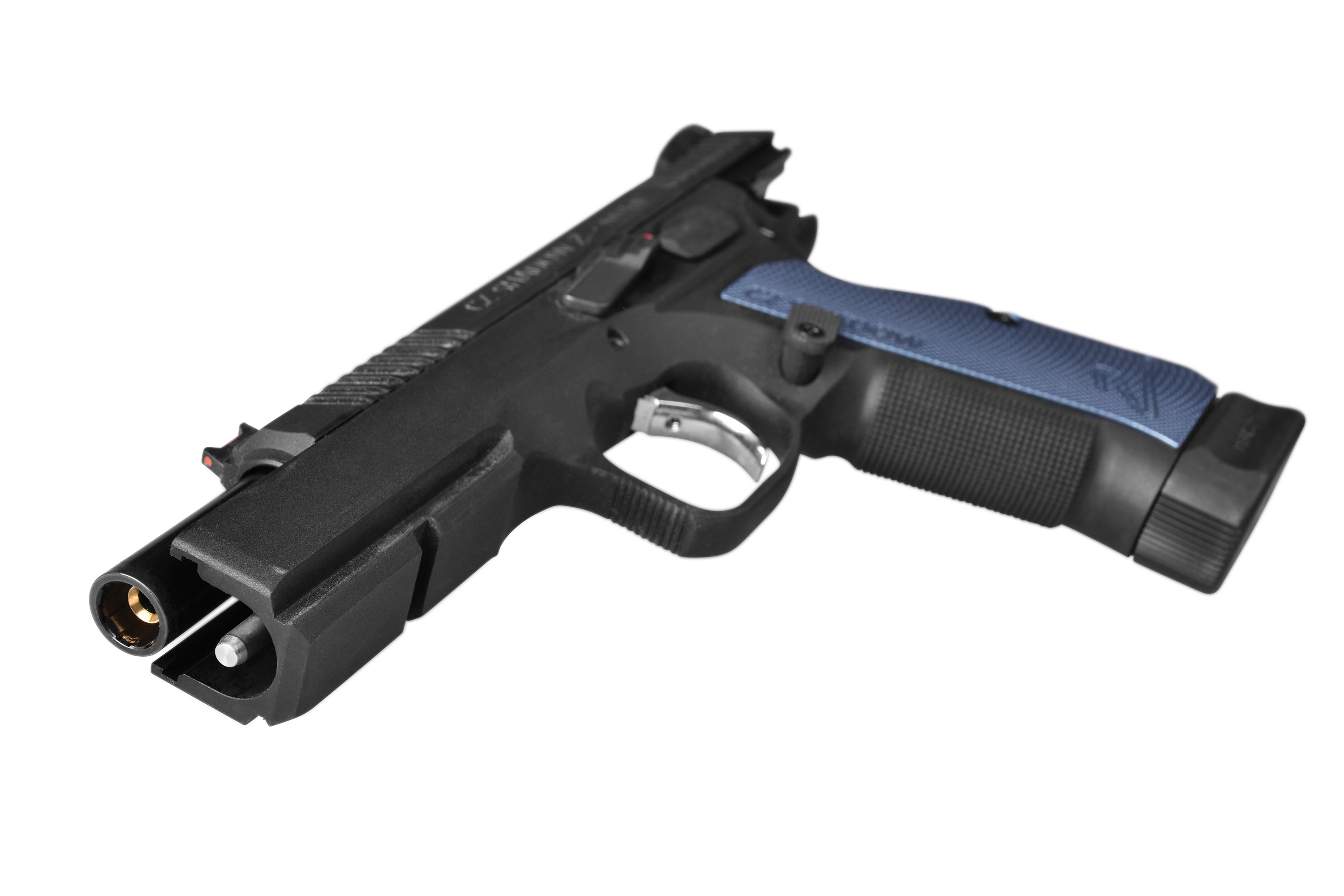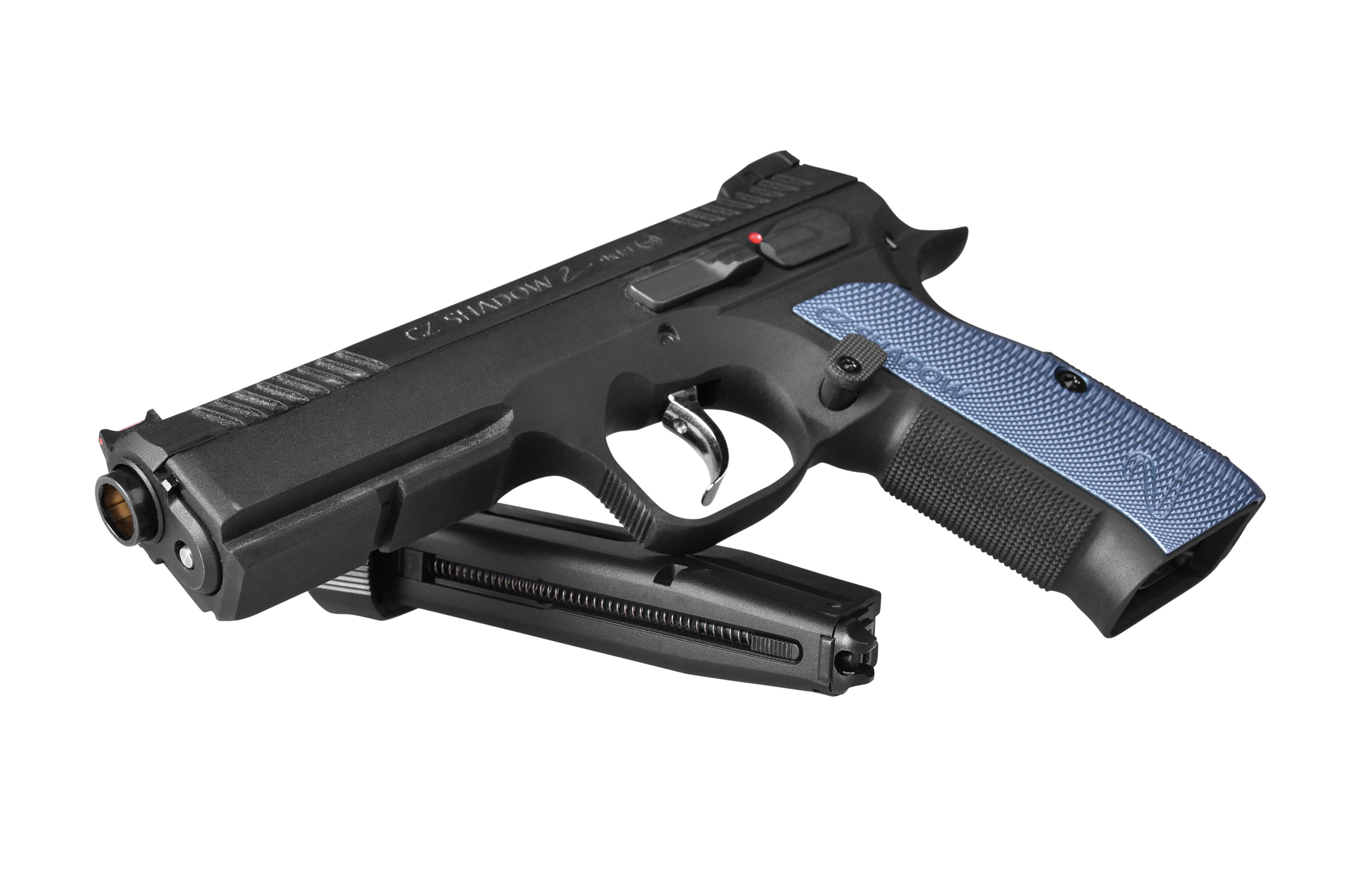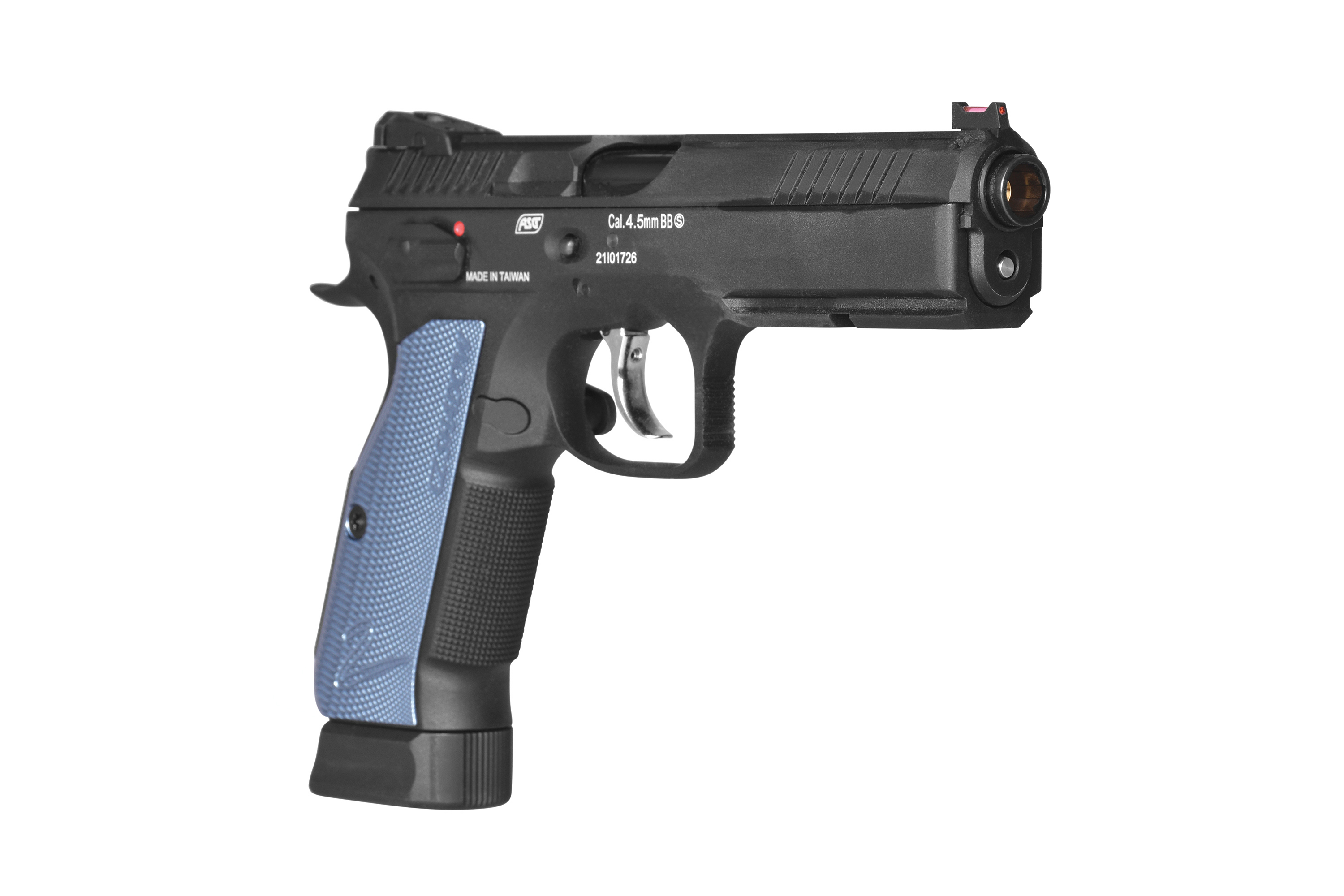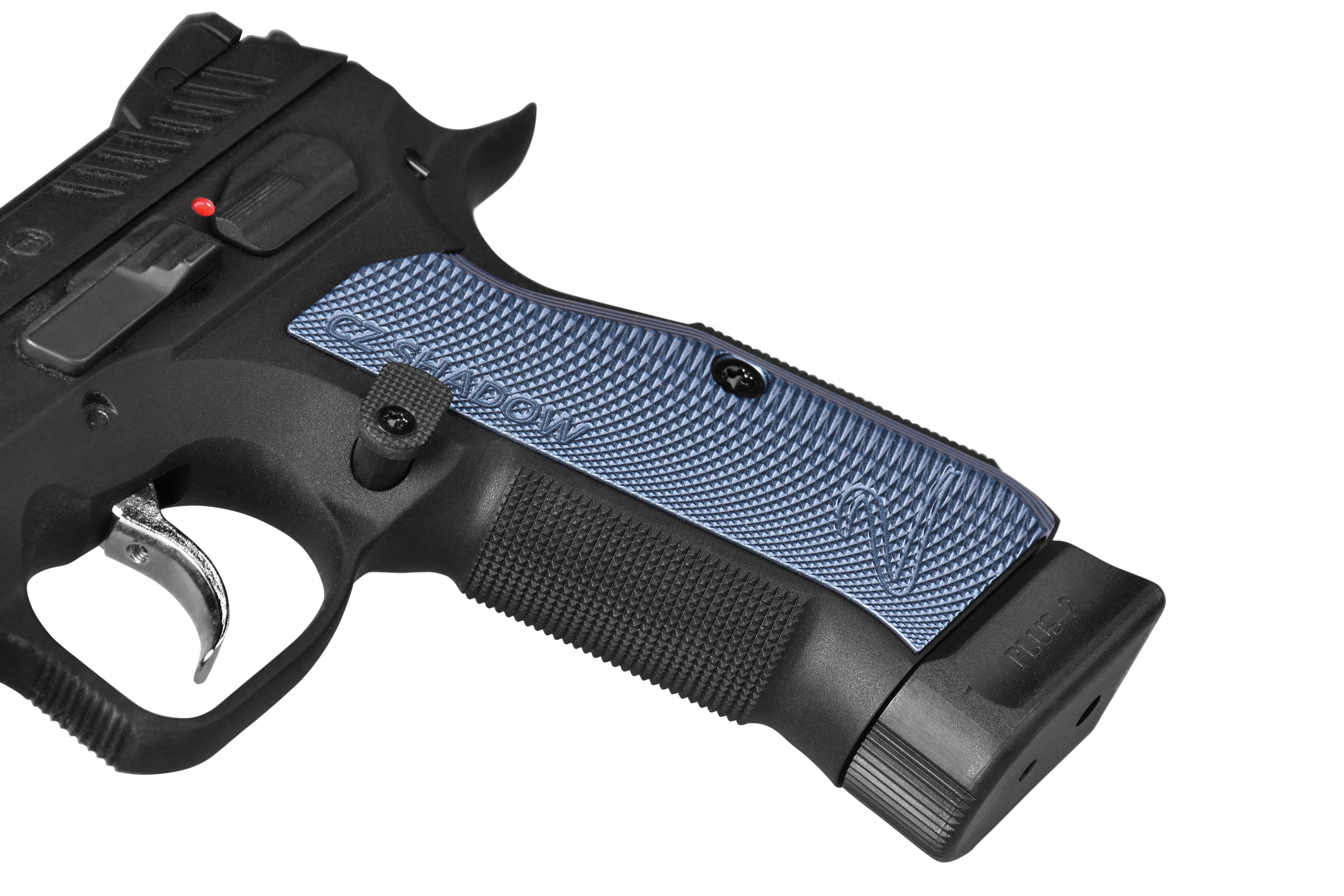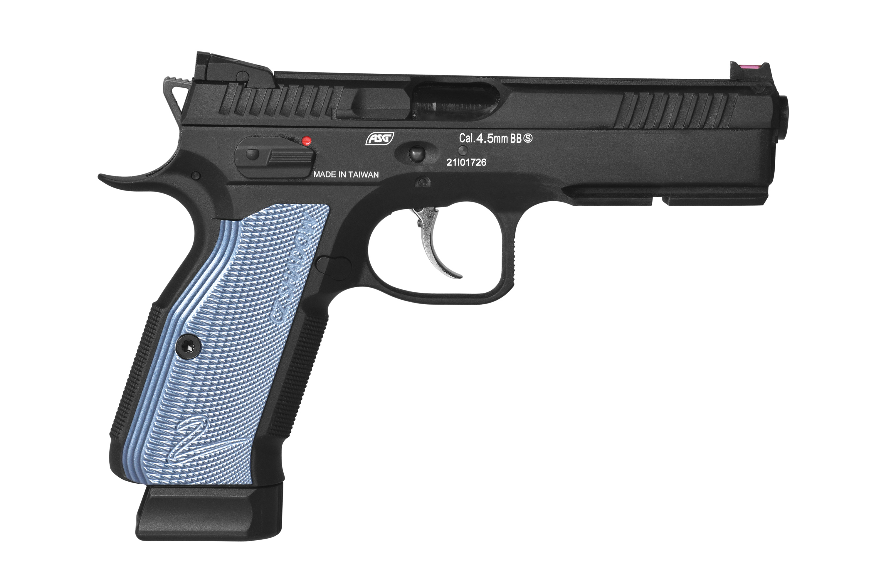 Die CZ Shadow2 Luftpistole wird von ASG lizenzgerecht gefertigt und trägt daher originalgetreue Markings und das CZ Logo. Die Druckluft Pistole CZ Shadow 2 hat im Vergleich zur CZ 75 SP-01 Shadow ein eckigeres Design. Der Schlitten ist aus eloxiertem Aluminium gefertigt. Tiefere und ausgeprägtere Serrations am Schlitten erlauben einen festeren Griff. Darüber hinaus fördert die ausgeprägte Struktur am Griffstück der Luftdruckwaffe in Kombination mit den CNC-gefrästen Griffschalen mit dünnerem Profil einen optimalen Grip.