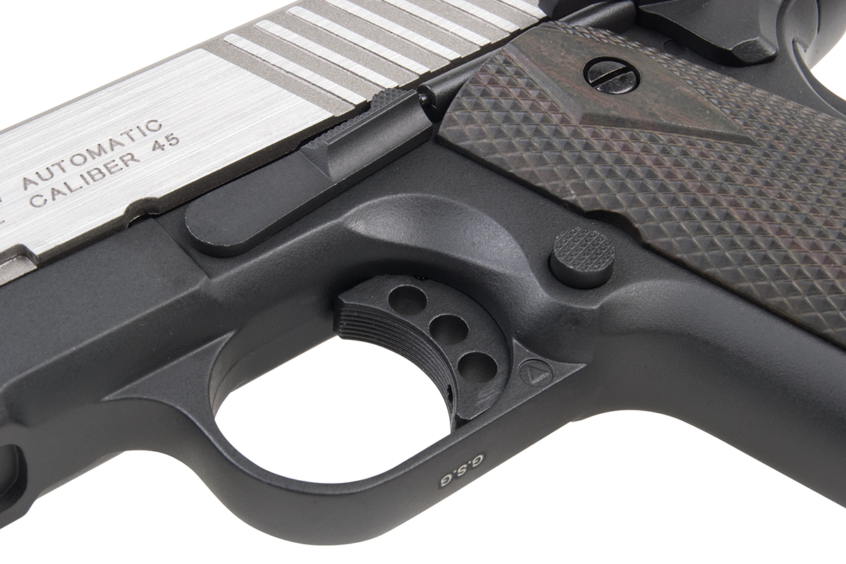 Ein besonderes Highlight der Colt 1911 Railgun Bicolor Softair Pistole sind die Griffschalen in Holzoptik mit Checkering, die nicht nur stilvoll aussehen, sondern auch für einen sicheren Halt sorgen. Der strukturierte Pistolengriff und das vergrößerte Abzugsfenster verbessern die Ergonomie und Handhabung, wodurch die Softairpistole besonders benutzerfreundlich ist.