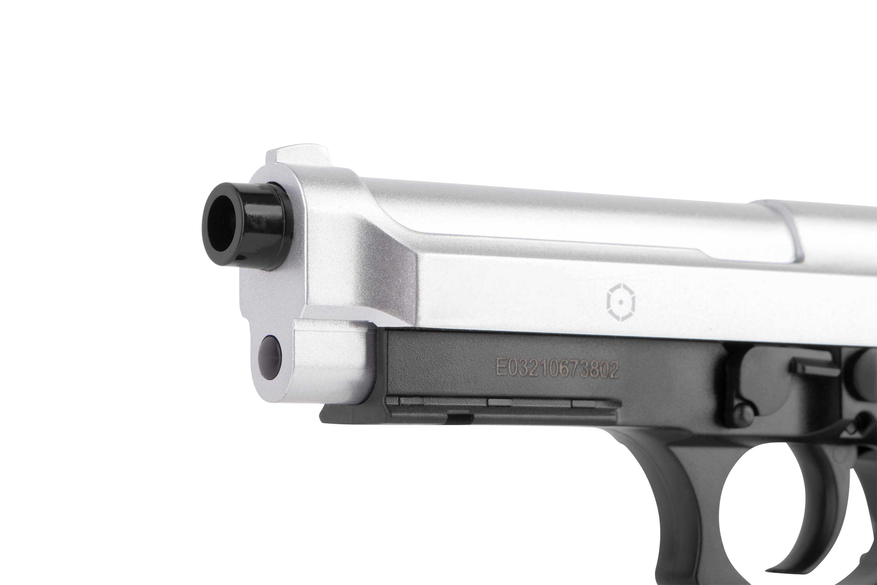 Zum Zielen bietet dir die Softair Waffe eine Visierung bestehend aus Kimme und Korn. Die Zielvorrichtung ist starr, kann also nicht verstellt werden. Unterhalb des Laufs befindet sich zudem eine eingefräste 21mm Picatinny Schiene. Eine individuelle Seriennummer rundet das Gesamtbild ab. Für eine verbesserte Trefferquote ist im Inneren ein voreingestelltes BAX System verbaut. Die Sicherung der Pistole ist eine manuelle Sicherung in Form eines Schiebereglers über dem Abzug. Die manuelle Sicherung kann bei dieser Soft Air von links betätigt werden. Der Abzug ist ein SA/DA Abzug, also Single Action und Double Action.
