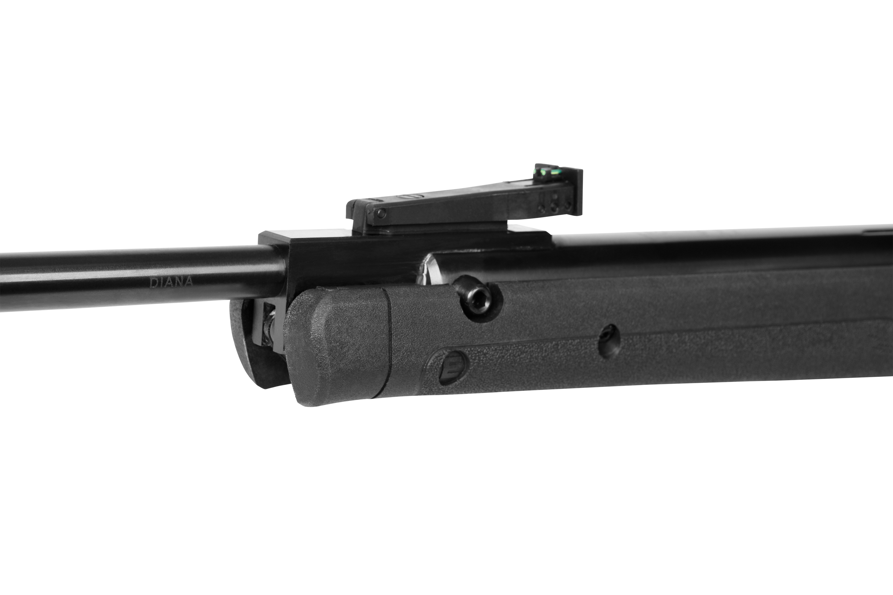 Für die Zielerfassung ist das DIANA Luftgewehr 34 Black mit einer Fiberoptik-Visierung ausgestattet, die sowohl einstellbar als auch austauschbar ist. Diese Visierung bietet klare und helle Ziele, selbst bei schwierigen Lichtverhältnissen, und kann bei Bedarf durch andere Zielhilfen ersetzt werden. Zusätzlich ist das Knicklauf Luftgewehr mit einer 11mm Schiene ausgestattet, die die Montage von Zielfernrohren oder anderen optischen Hilfsmitteln, wie z.B. einem Red Dot ermöglicht.