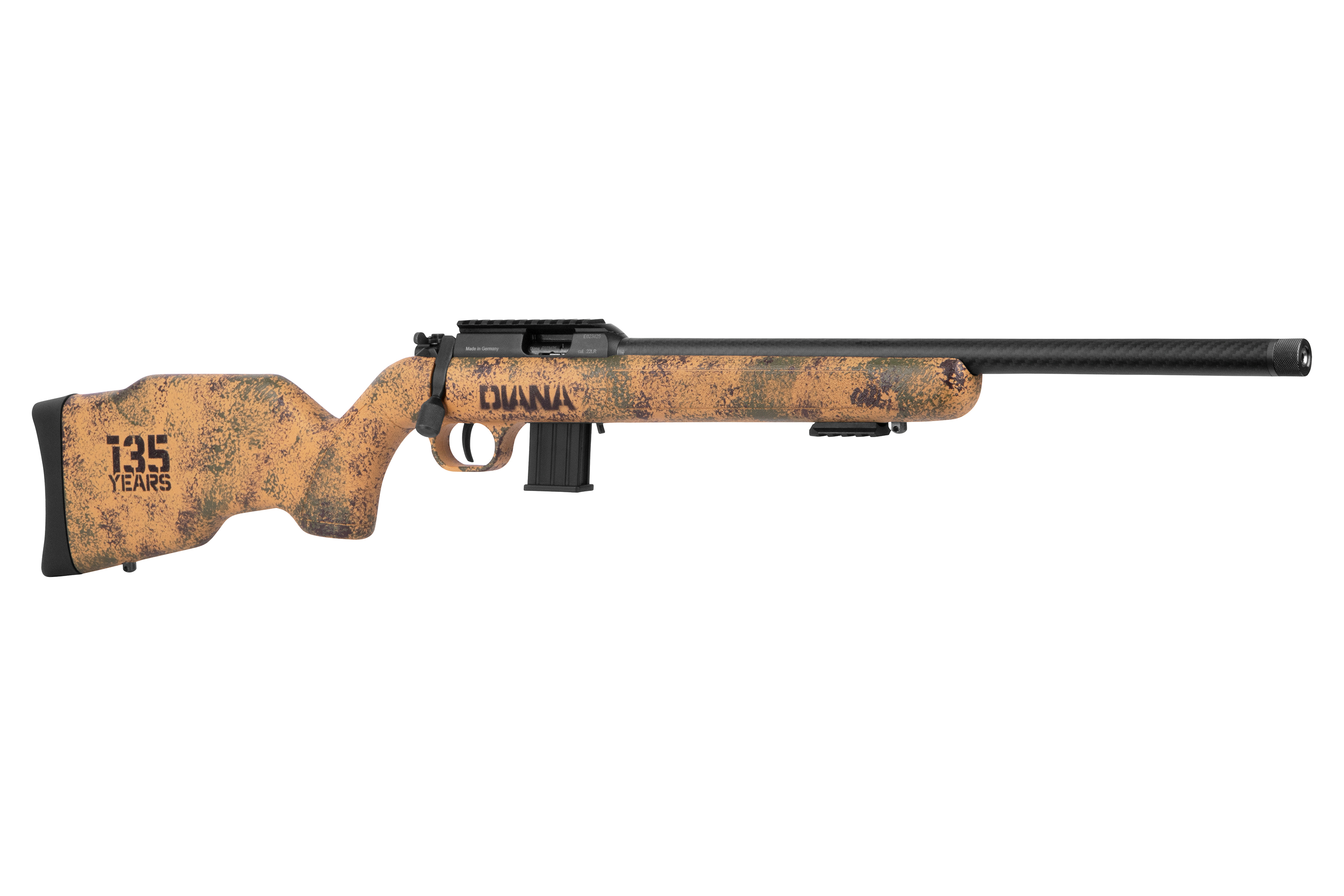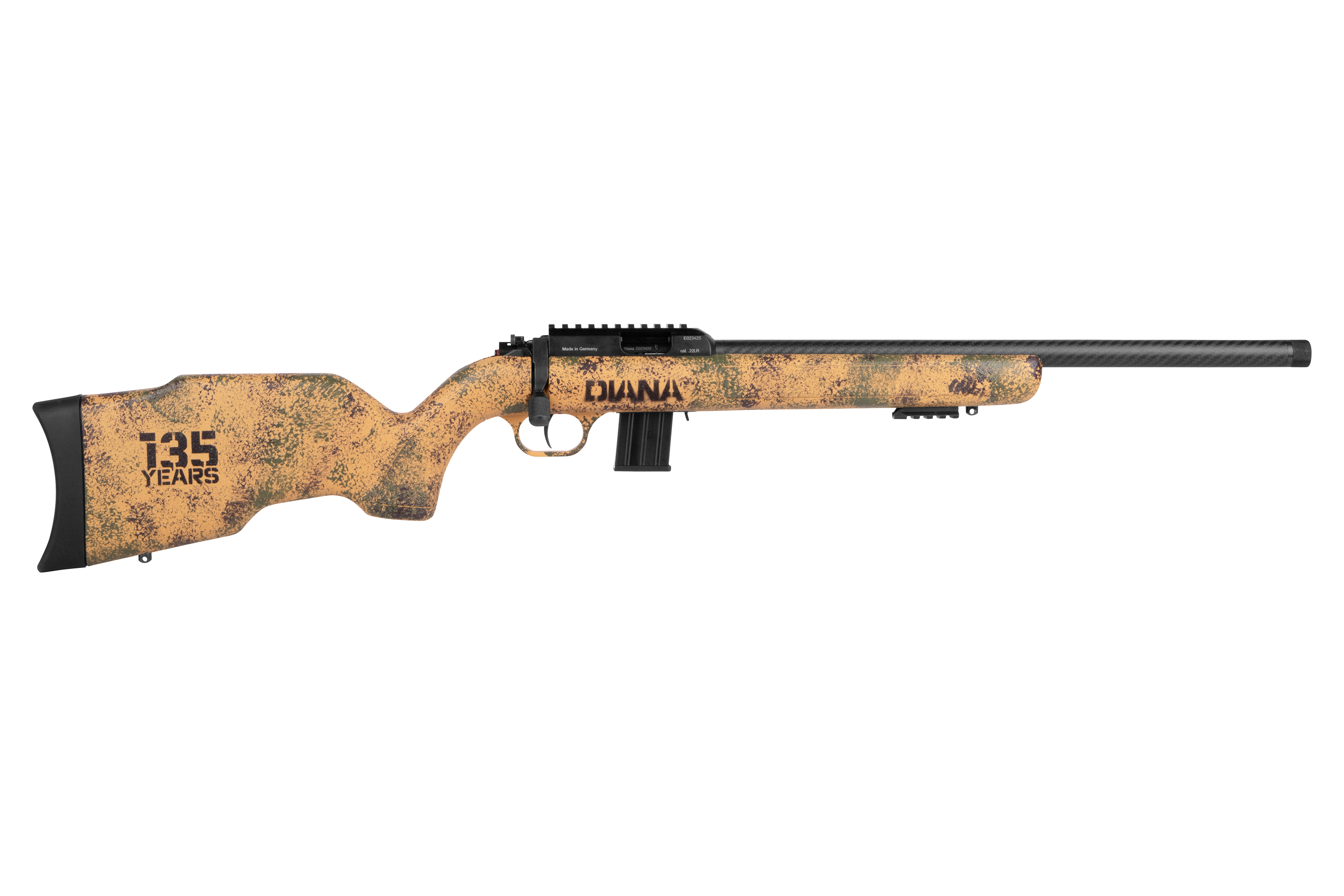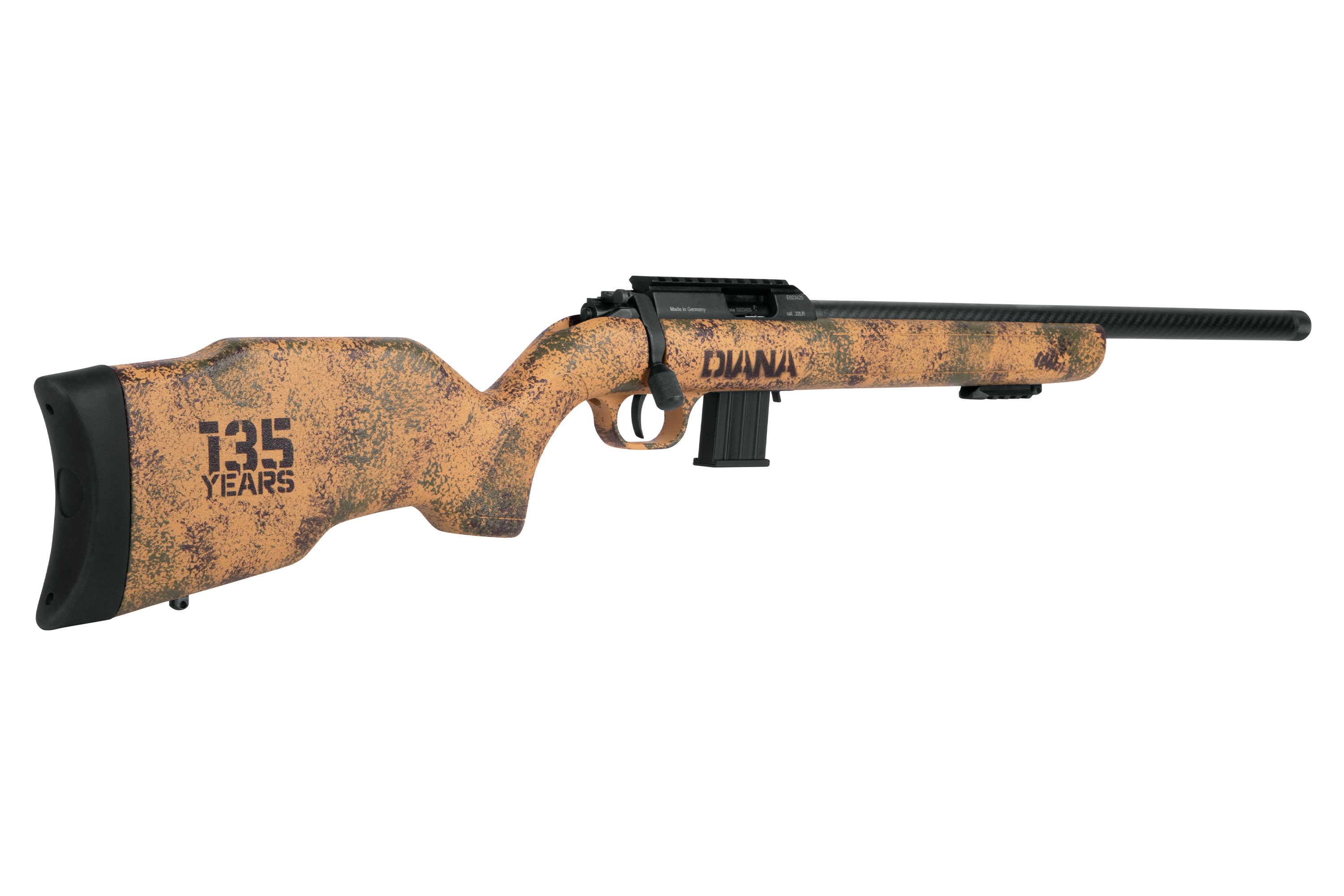 Ein besonderes Highlight ist der robuste Allwetter-Polymer-Schaft im markanten US-TAN-Dots-Design. Jeder Schaft wird von Hand bemalt, wodurch jede DIANA R-22 Anniversary Carbon ein echtes Einzelstück ist. Das dezent platzierte 135-Jahre-Jubiläumslogo unterstreicht den exklusiven Charakter dieser Sonderedition.