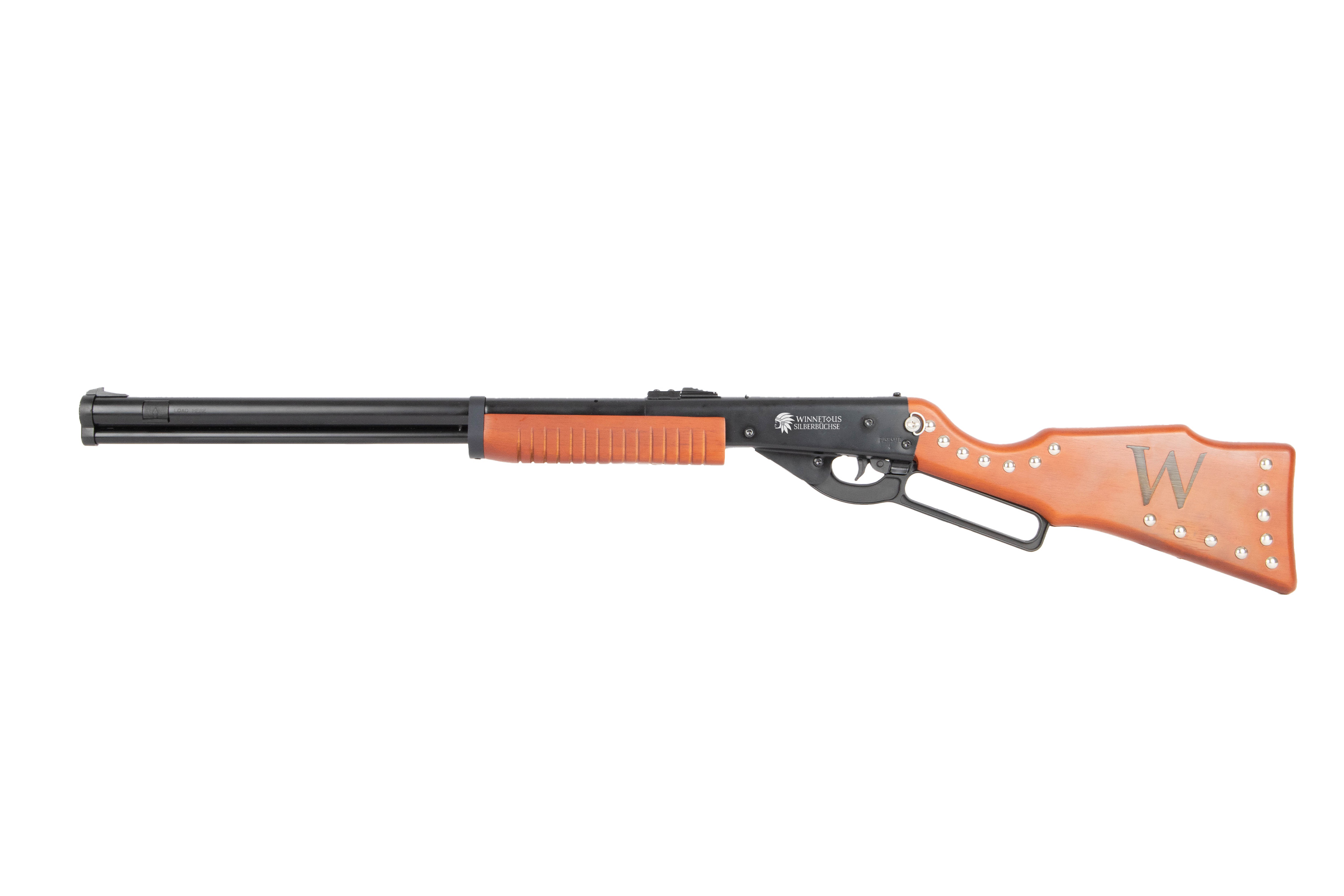 Die Winnetou Silberbüchse ist ein Federdruck-Luftgewehr, das mit 4,5 mm Stahlrundkugeln (BBs) betrieben wird.
