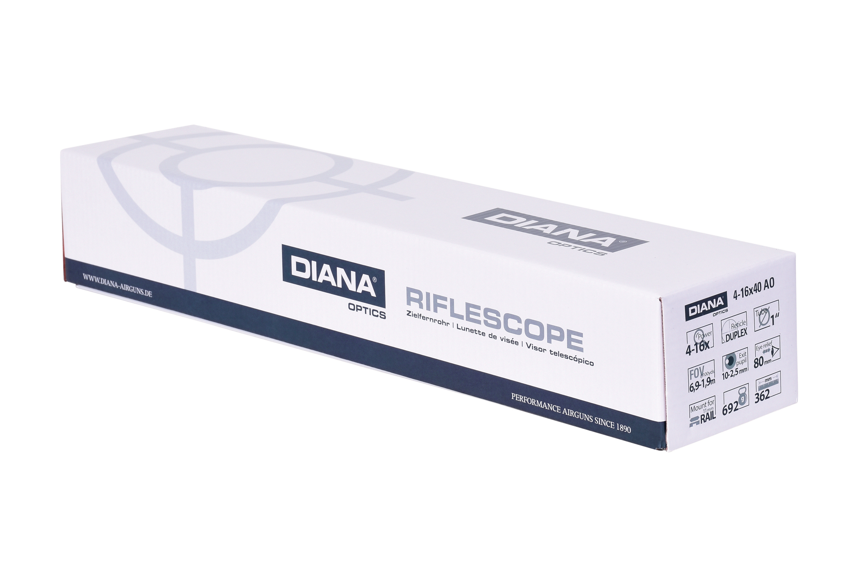Das DIANA 4-16x40 mit Zero-Reset Funktion verfügt über hochwertig vergütete Linsen, durch die ein naturgetreues und kontrastreiches Bild erreicht wird. Ein Beschlagen der Linsen wird durch eine Stickstofffüllung im Inneren verhindert. Es verfügt über einen Parallaxenausgleich ab 5 Yards und ist wasserdicht und schussfest.