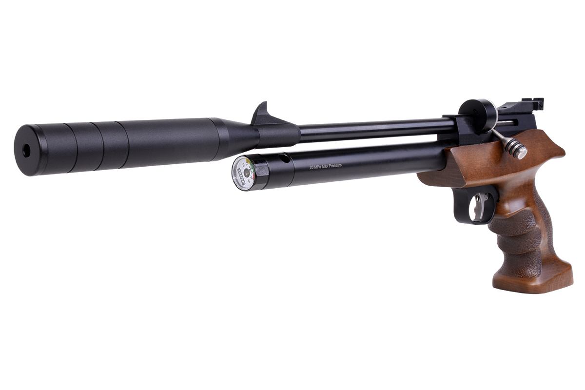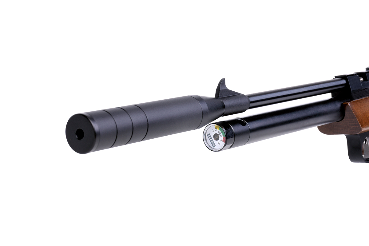 Für eine optimale Schussleistung ist die Luftpistole mit einem integrierten Regulator ausgestattet. Dieser gewährleistet eine konsistente und präzise Munition Abgabe, die zur Treffsicherheit beiträgt. Der ergonomische Griff aus Buchenholz sorgt für einen komfortablen und sicheren Halt, der eine präzise Platzierung deiner Schüsse ermöglicht. Im Inneren der Druckluftpistole ist ein solides System aus Metall verbaut. Der aufgedrehte Schalldämpfer minimiert Geräusche, so dass du ungestört schießen kannst.