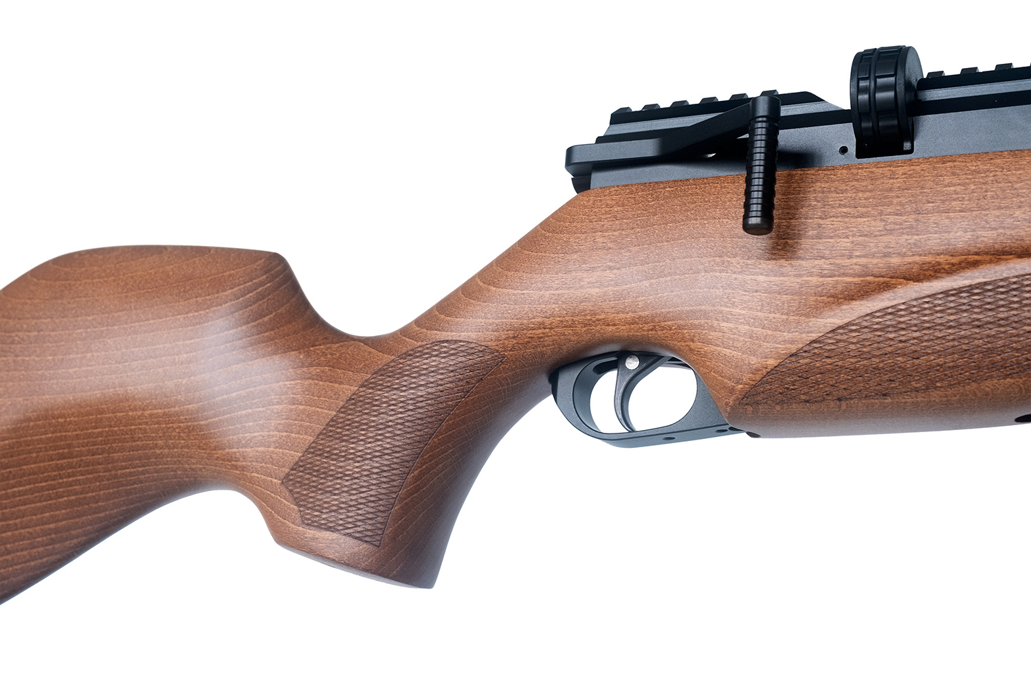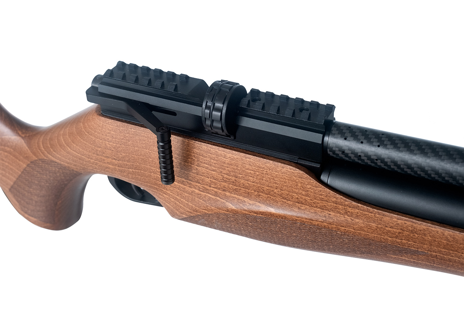 Der Laufmantel aus Carbon mit schalldämpfendem Effekt wird durch den ergonomisch geformten Gewehrschaft aus Buchenholz mit Fischhaut ergänzt. Die höhenverstellbare Schaftkappe und optimierte Spannhebelposition maximieren die Benutzerfreundlichkeit des Druckluft Gewehrs. Eine Riemenbügelöse am hinteren Ende der Waffe und die M-LOK Schiene am vorderen Ende des Schaftes ermöglichen eine einfache Handhabung.