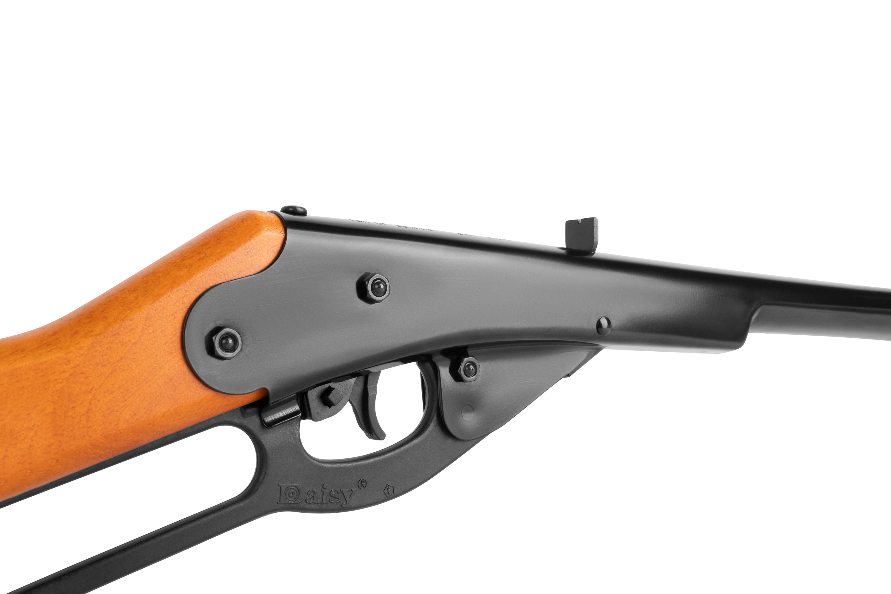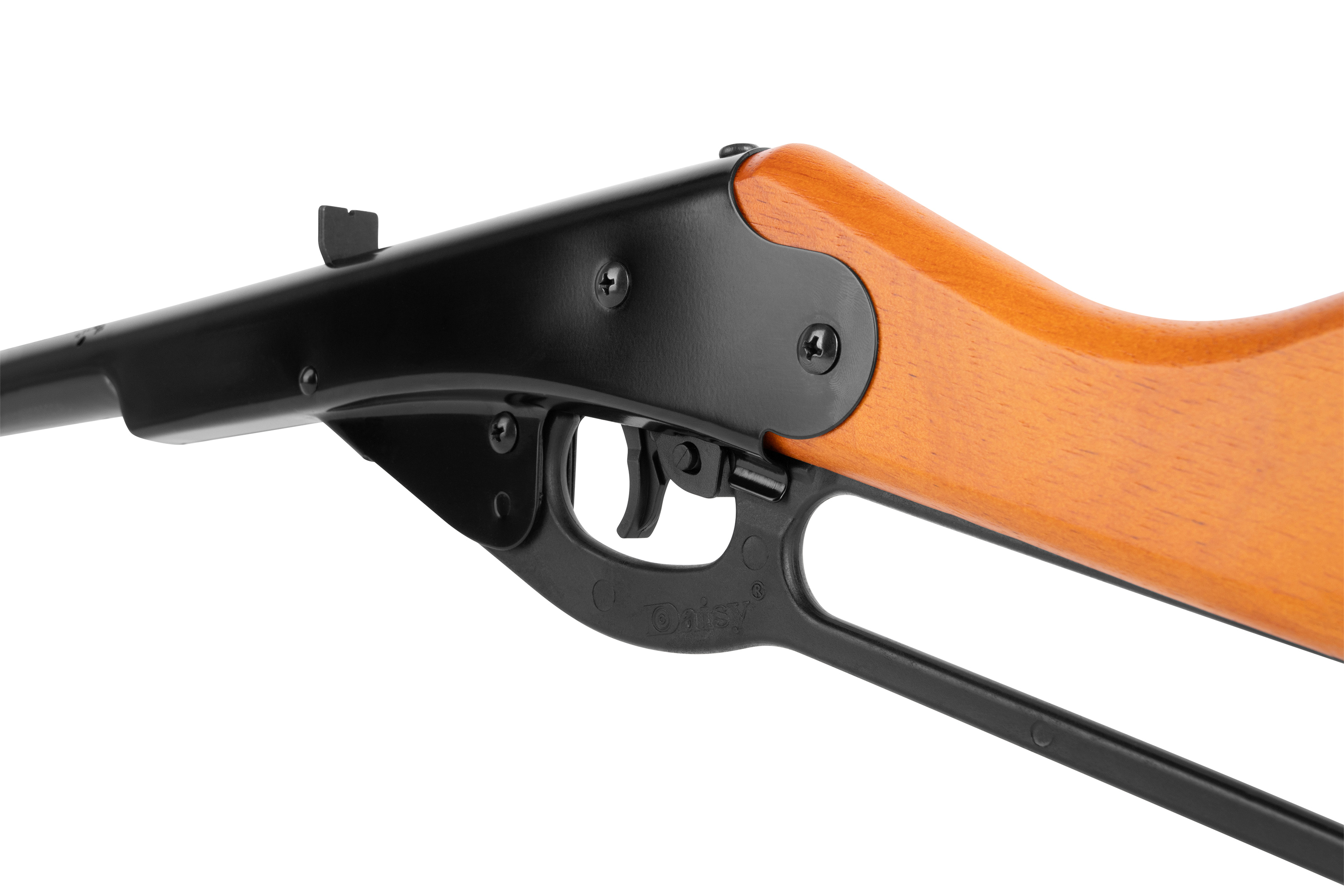 Das Spannen der Waffe geht bei dieser Ausführung besonders leicht. Eine Hand am Druckluft Gewehr, die andere Hand spannt; die Daisy Buck muss hierzu nicht einmal abgesetzt werden. Um beim Schießen optimal zu treffen kannst du die starre Visierung mit Kimme und Korn nutzen.