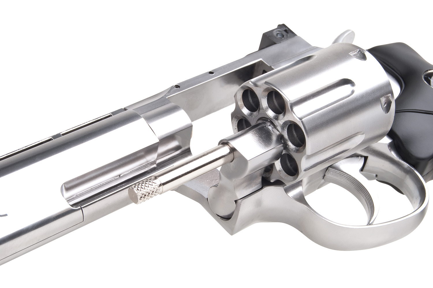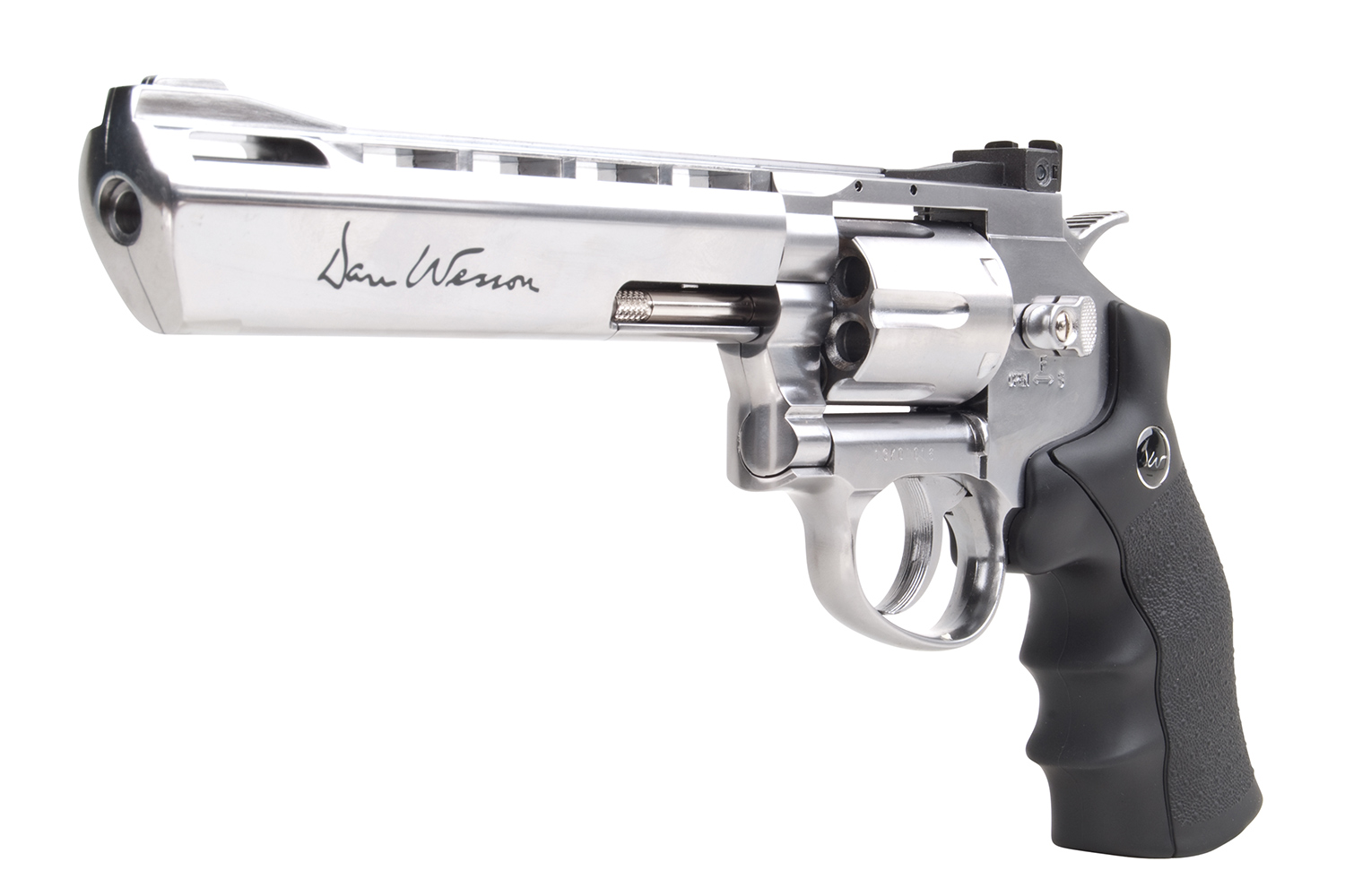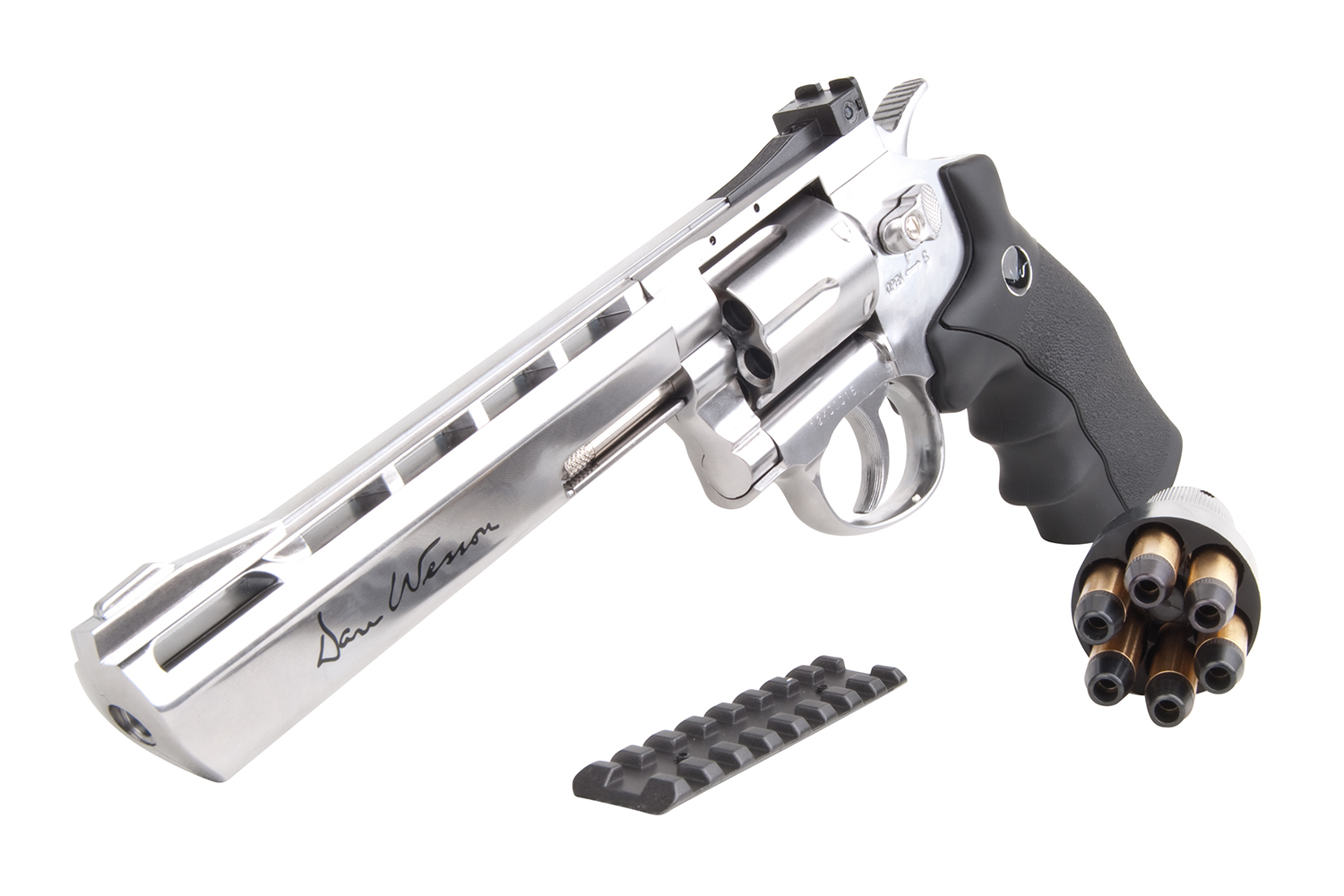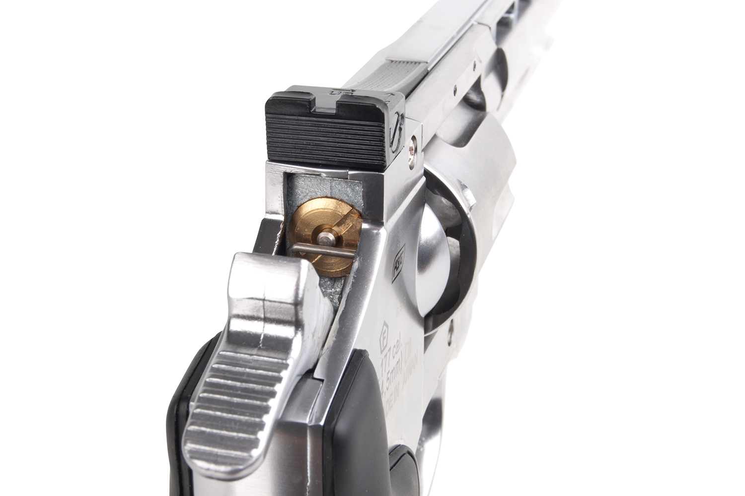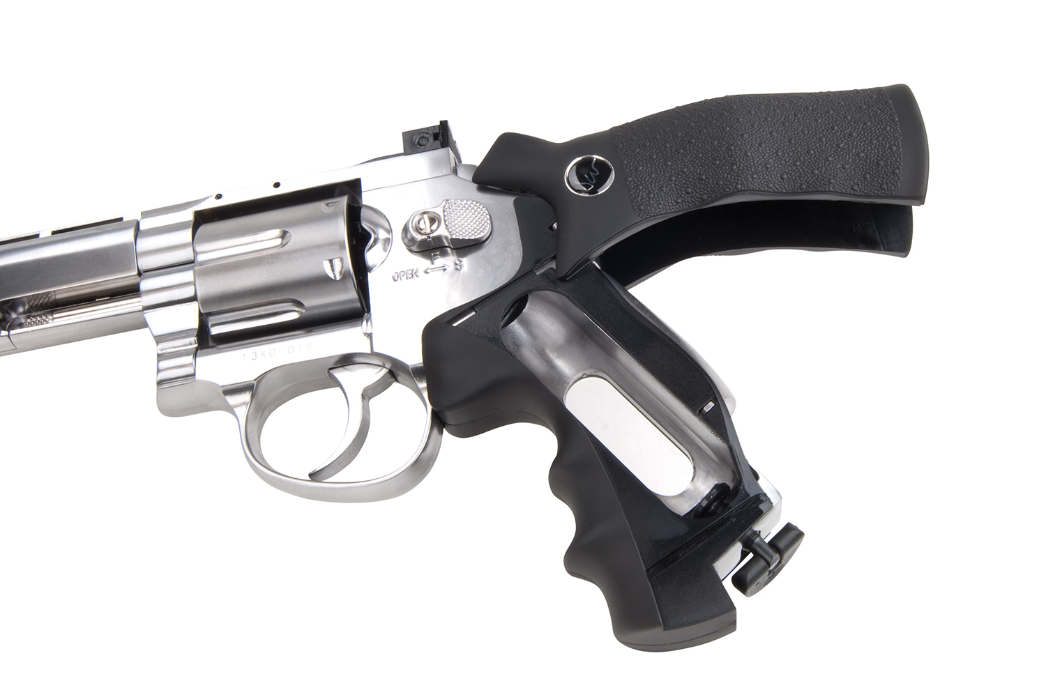 Der Revolver aus Vollmetall verfügt über einen Double Action Abzug, eine verstellbare hintere Visierung und robuste Kunststoffgriffschalen.