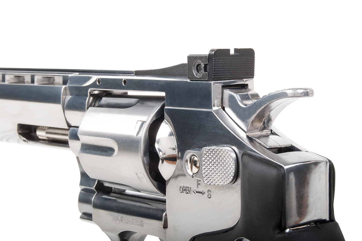 Der Softair Revolver besitzt zudem ein einstellbares Hop-Up System, das die Flugbahn der Airsoft Munition optimiert und somit eine verbesserte Schussgenauigkeit auf mittleren Distanzen ermöglicht. Die Kimme des Dan Wesson 715 Air Soft ist sowohl in der Höhe als auch seitlich verstellbar und bietet so eine verbesserte Zielerfassung.