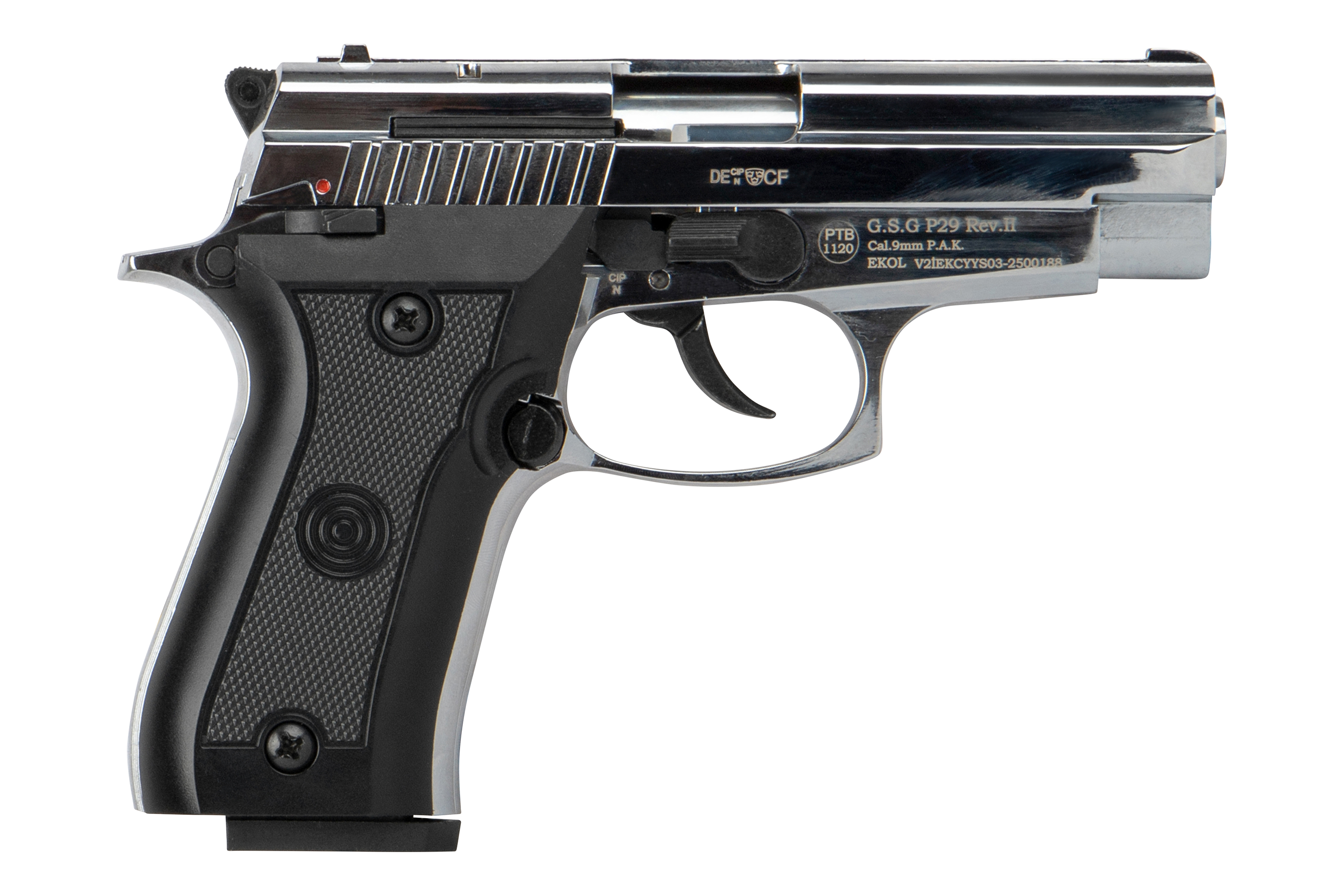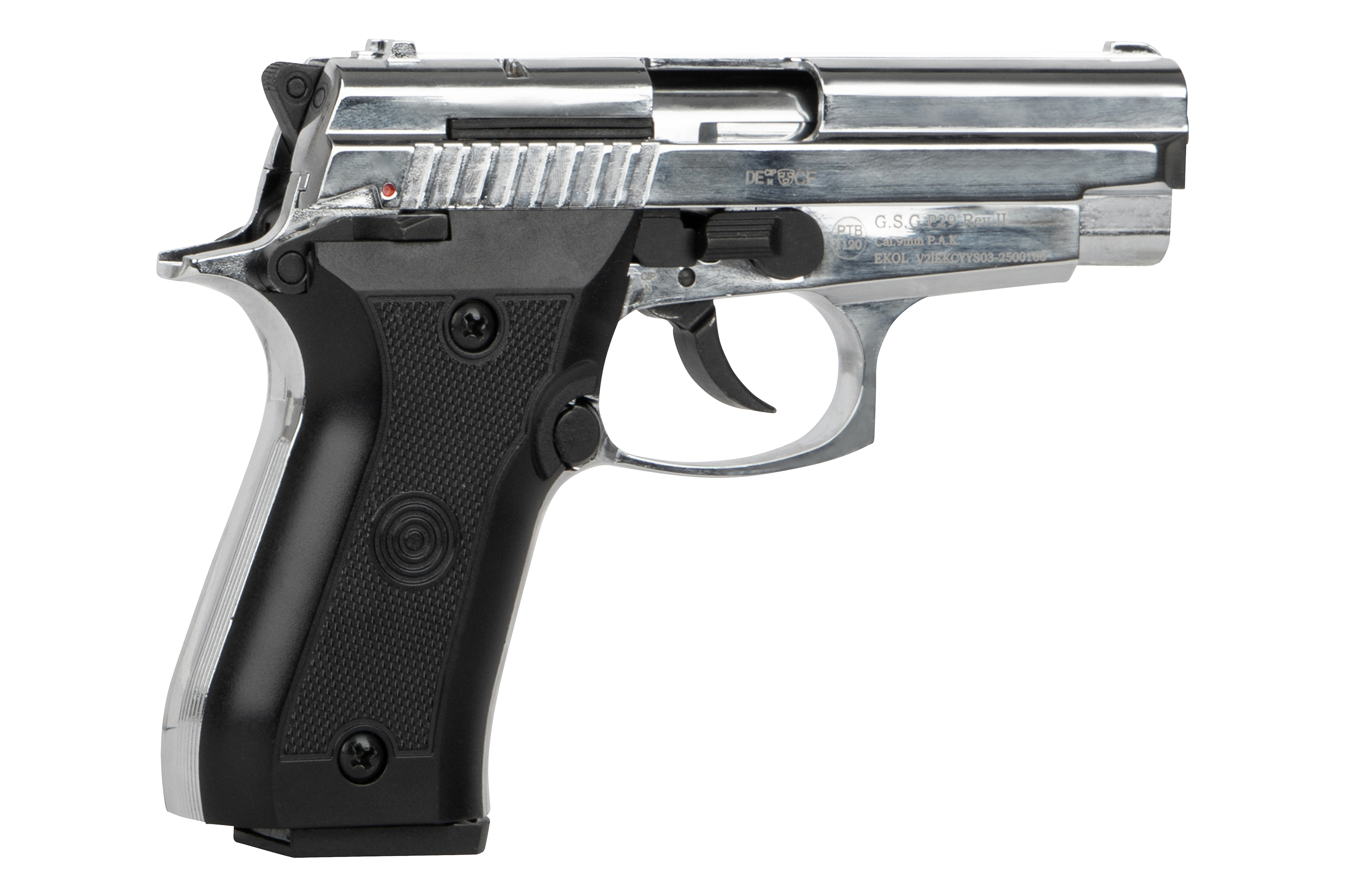 Die Ekol P29 Chrom ist eine kompakte Schreckschusspistole im Kaliber 9mm P.A.K., die durch ihre glänzende Chrom-Oberfläche und robuste Verarbeitung hervorsticht. Mit ihrem eleganten Design und der soliden Bauweise ist sie sowohl für den Einsatz an Silvester als auch für die Selbstverteidigung mit Gas- oder Pfefferpatronen bestens geeignet.