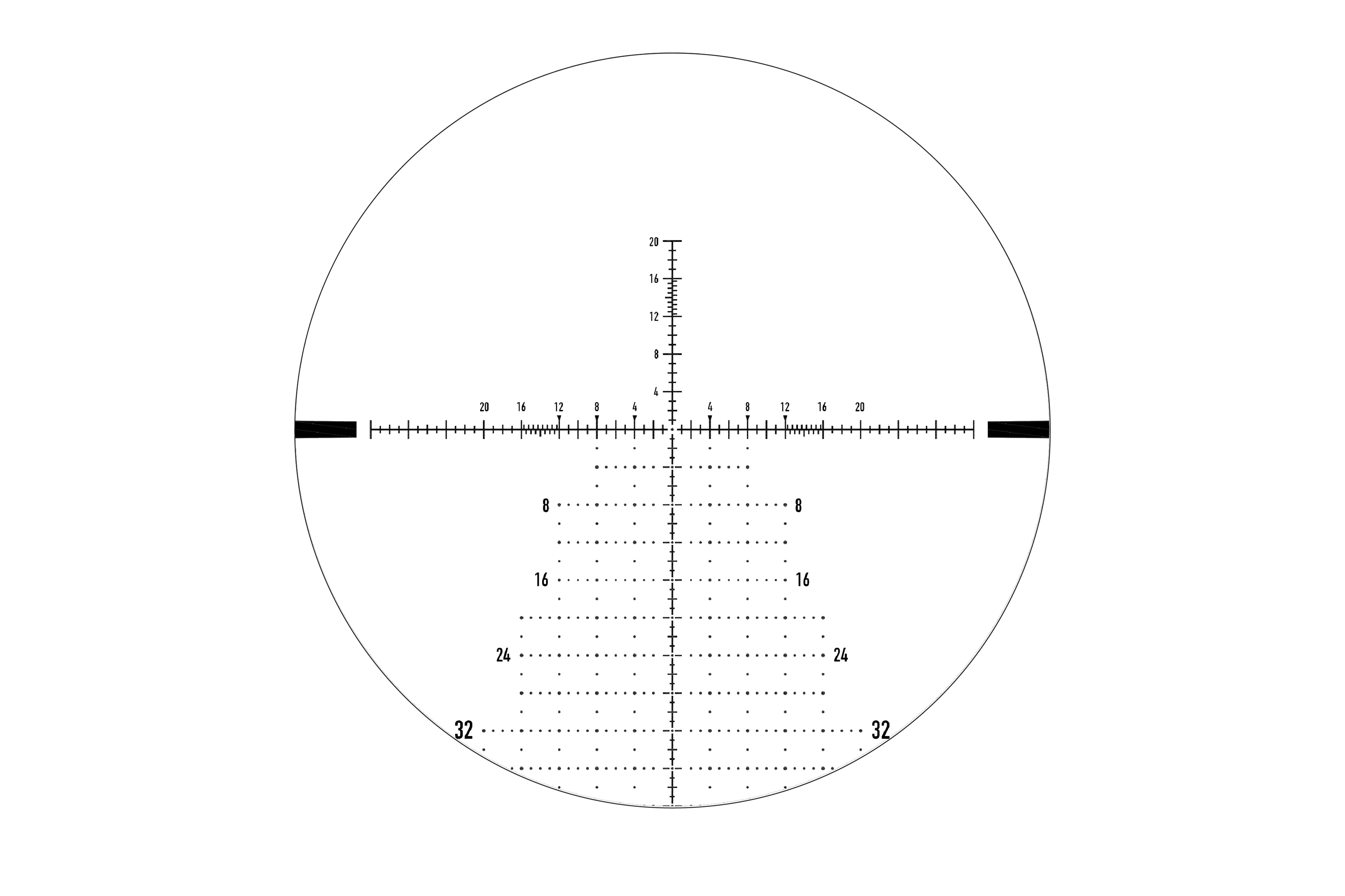- Verjüngte Balken, um das Auge bei allen Vergrößerungen auf die Mitte des Absehens zu lenken