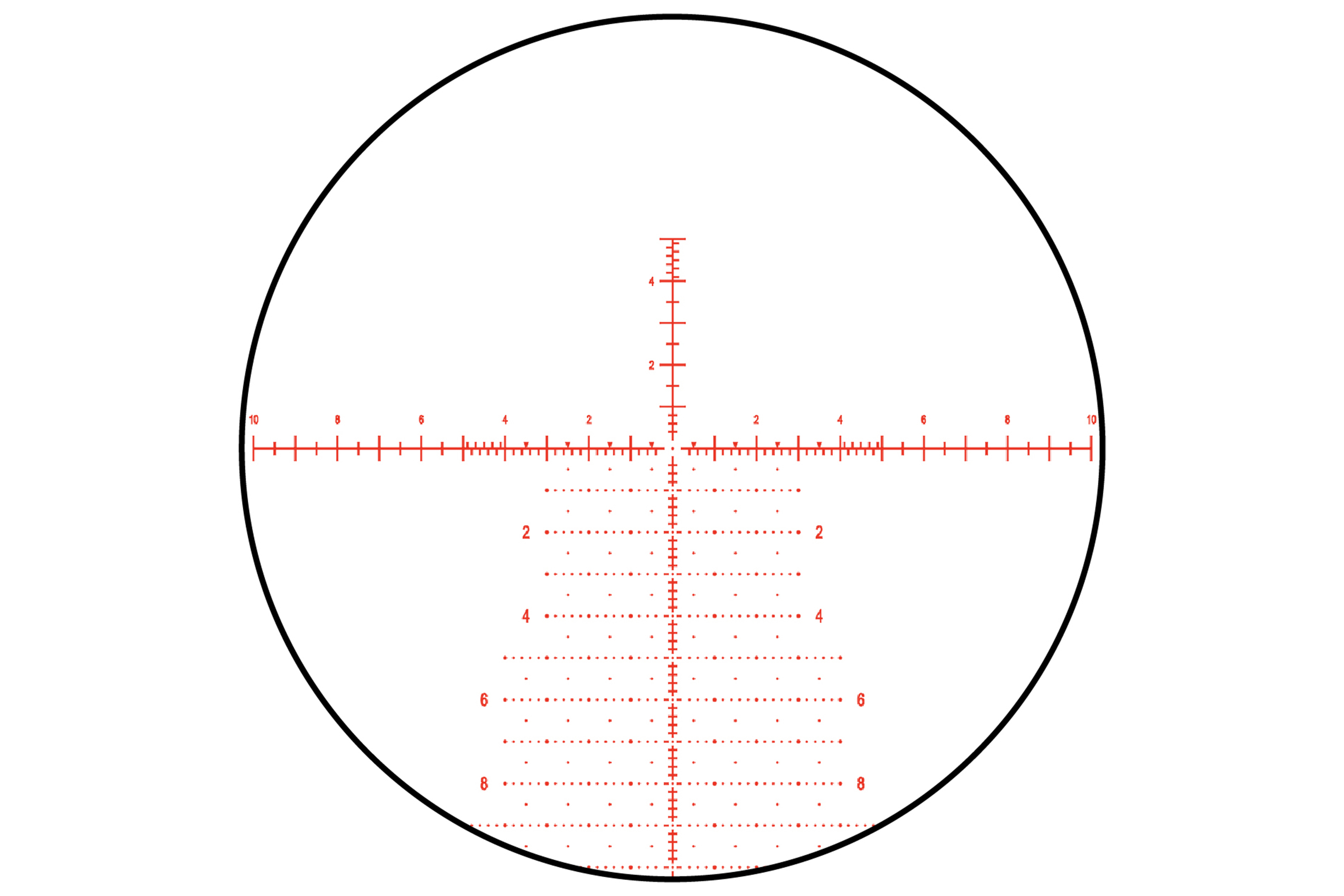 - Verjüngte Balken, um das Auge bei allen Vergrößerungen auf die Mitte des Absehens zu lenken