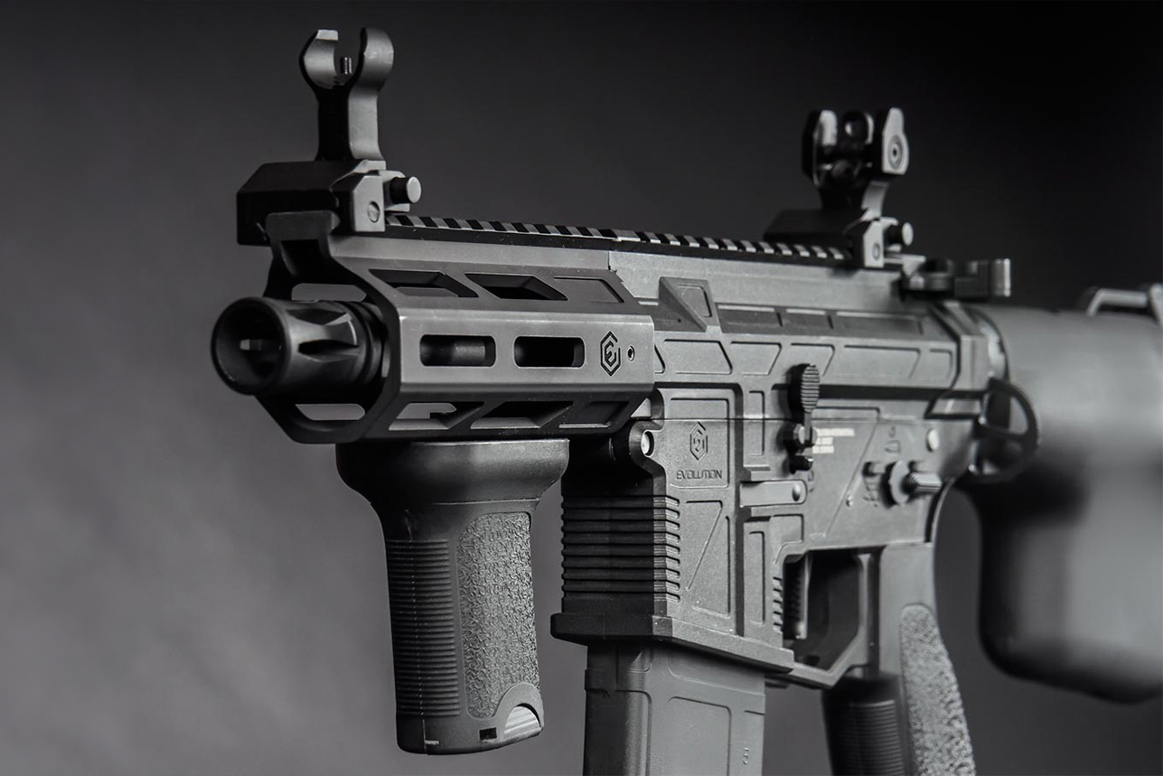 Das Hauptgehäuse der Airsoft S AEG sticht durch das markante Design im M4 / M16 Style besonders ins Auge. Das Gehäuse der Softairwaffe besteht aus einem speziell ausgewählten CARBONTECH Polymer, der eine außergewöhnliche Stabilität und hohe Qualität aufweist. Das Griffstück besteht aus strapazierfähigem Polymer und gewährleistet mit einer angerauten Oberfläche einen sicheren Halt. Hier kommt man auch werkzeuglos an den Motor. Der Handschutz (Free Float EMR - Evolution Modular Rail Handguard) hingegen ist aus ultraleichtem CNC gefrästem Aluminium gefertigt und kommt im M-LOK® Design. An den M-LOK® Öffnungen kannst du entsprechende Softair Ausrüstung mit LOCK befestigen. Diese Ausführung wird inklusive Frontgriff gelifert. An der Vorderseite ist außerdem ein Flash Hider (Mündungsfeuerdämpfer) im Standard Birdcage Look angebracht. Bei dem Lower Receiver handelt es sich um einen Monolithic Receiver, d.h. er ist einteilig. Der Vorteil eines Monolithic Receivers liegt in der verbesserten Stabilität und Steifheit der Waffe. Durch die einheitliche Konstruktion wird die Möglichkeit von Verwindungen oder Spiel zwischen den einzelnen Empfängerteilen minimiert. Dies kann zu einer erhöhten Präzision und Zuverlässigkeit beim Schießen führen. Durch die abgestimmte Farbgebung harmoniert das Gewehr optisch perfekt mit den Aluminiumteilen und erzeugt einen nahtlosen Gesamteindruck. Auch Logos und die fortlaufende Seriennummer sind sauber auf die Softair Waffe eingraviert.