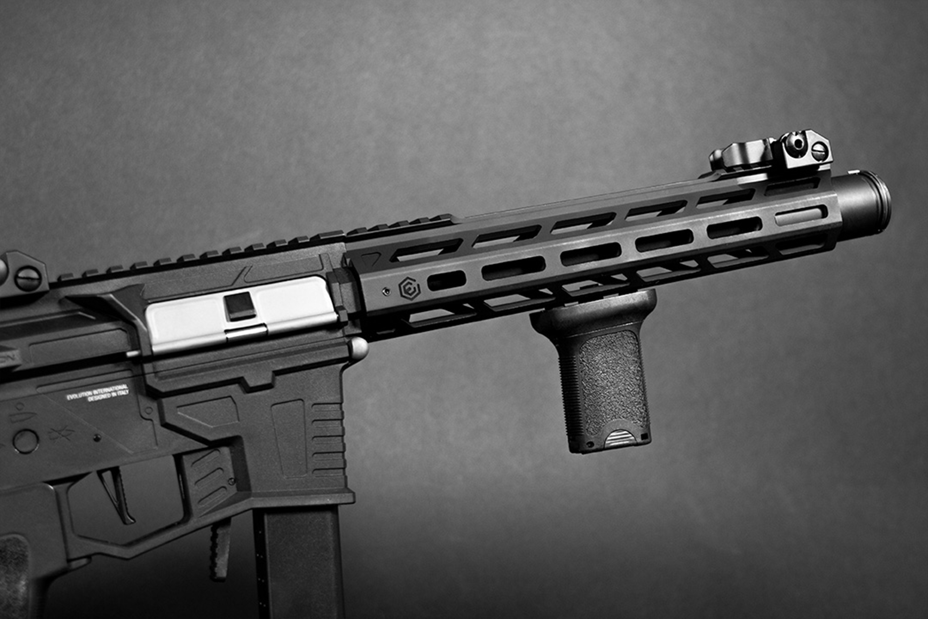 Das Evolution Reaper Airsoft wurde mit Präzisionsmechanik und Spitzentechnologie entwickelt und bietet Airsoftspielern unvergleichliche Feuerkraft, Zuverlässigkeit und Vielseitigkeit auf dem Airsoft Spielfeld. Die Evolution Reaper Softair ist aus Metall und Carbontech gefertigt. Dies sorgt für eine lange Lebensdauer und ein realistisches Gewicht und Gefühl. Der ergonomische Pistolengriff und ein 6-Positionen Sopmod Schaft sorgen für mehr Komfort und Kontrolle, so dass du auch bei intensiven Wettkämpfen deine Genauigkeit und Manövrierfähigkeit behalten kannst. Der Handschutz (Free Float EMR - Evolution Modular Rail Handguard) hingegen ist aus ultraleichtem CNC gefrästem Aluminium gefertigt und kommt im M-LOK® Design. An den M-LOK® Öffnungen kannst du entsprechende Softair Ausrüstung mit LOCK befestigen. Diese Ausführung wird inklusive Frontgriff geliefert. An der Vorderseite ist außerdem ein Sound Amplifier angebracht.