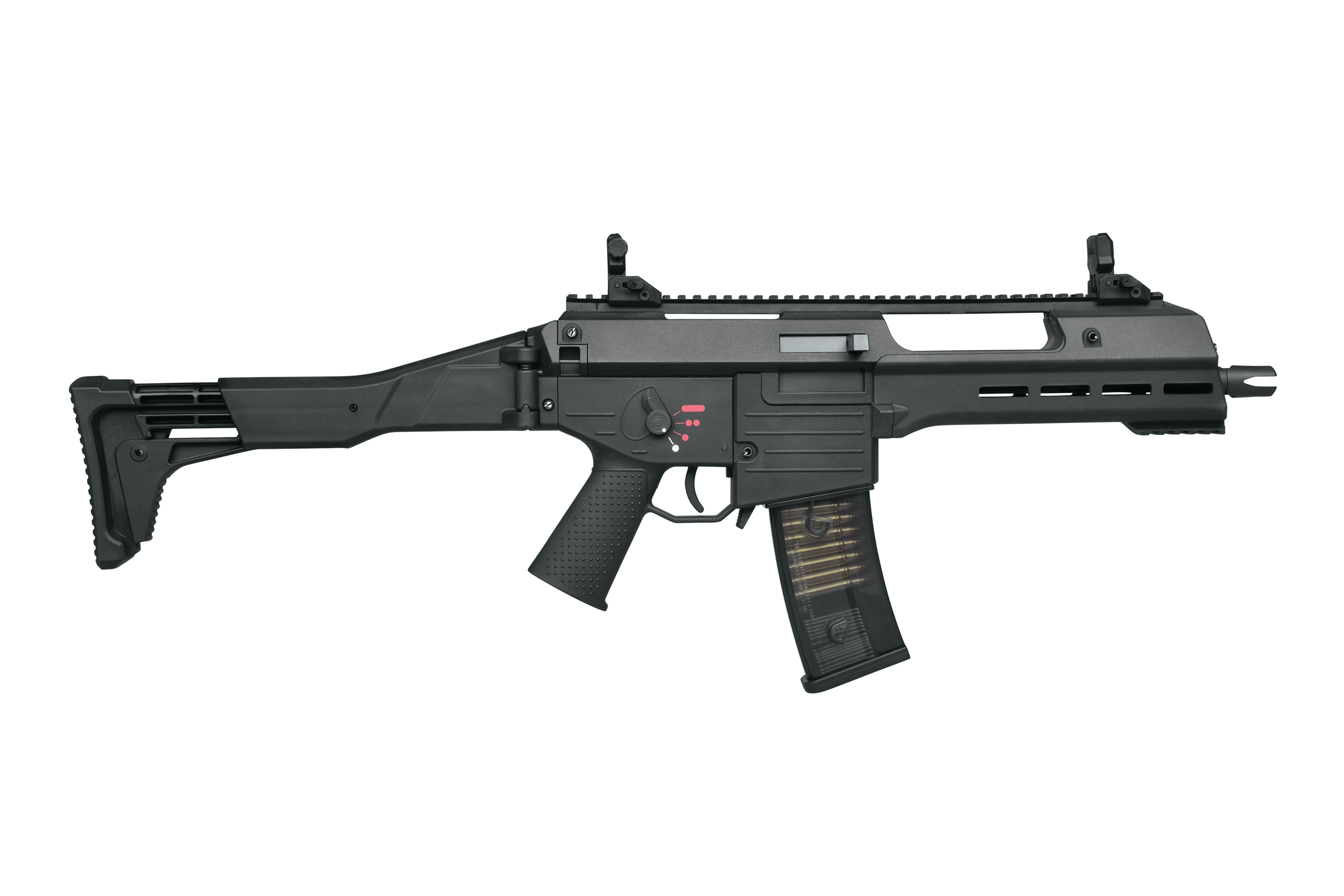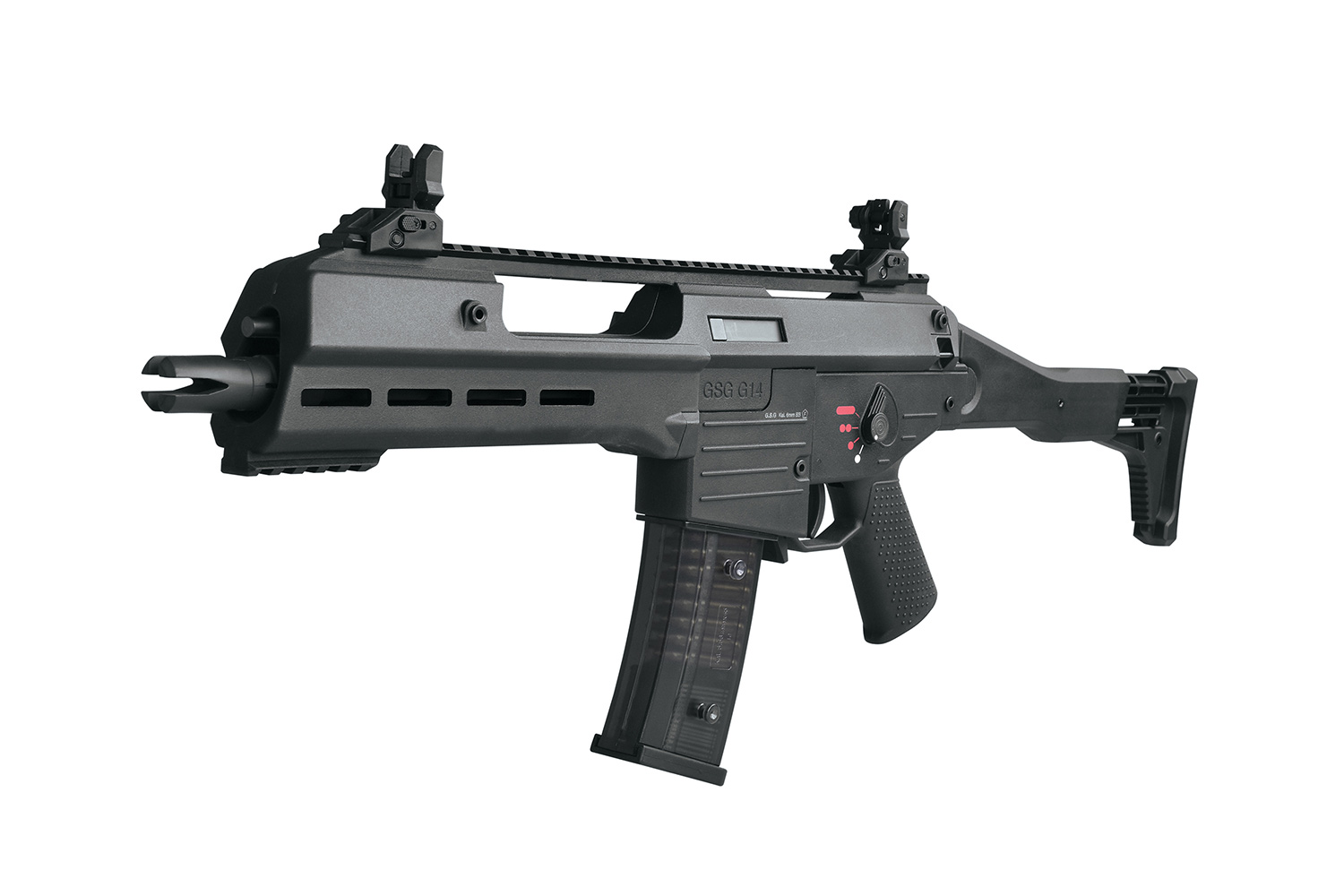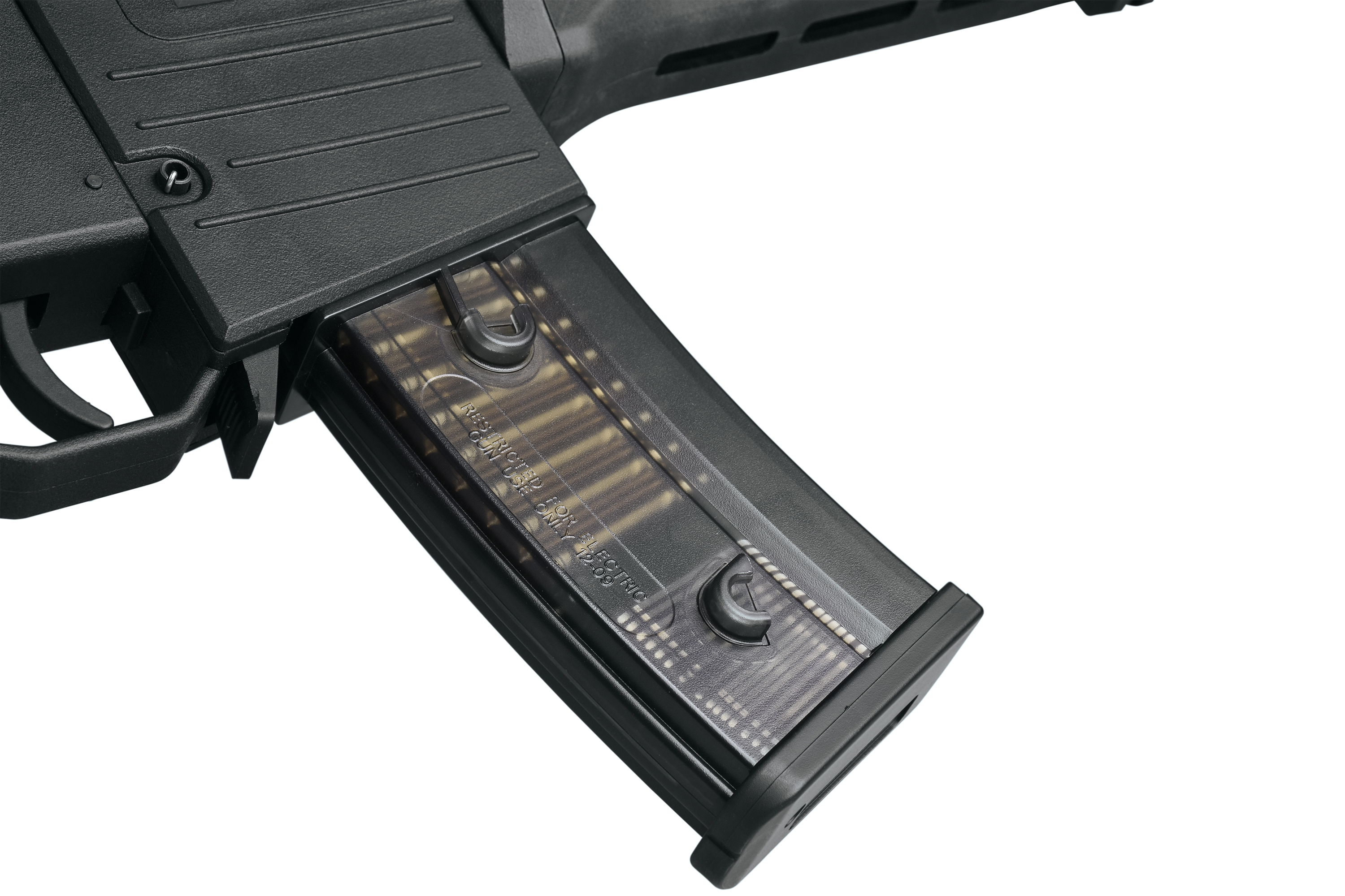 Die Electronic Blow-Back Funktion 'Real Power' sorgt durch eine doppelte Federung für einen starken, realistischen Rückstoß. Der neu designte Klappschaft mit verstellbarer Schulterstütze bietet maximalen Komfort. In Kombination mit dem Anti-Slip Griffstück erhältst du eine Waffe, die sich ausgezeichnet führen lässt. Du kannst die GSG 14 Carbine nach Belieben mit einem Silencer (14mm CCW) oder auch anderem verschiedenen Zubehör, dass du z.B. auf der Picatinnyschiene anbringen kannst, ausstatten. Die Flip-Up-Visierungen stellen sich per Knopfdruck auf.