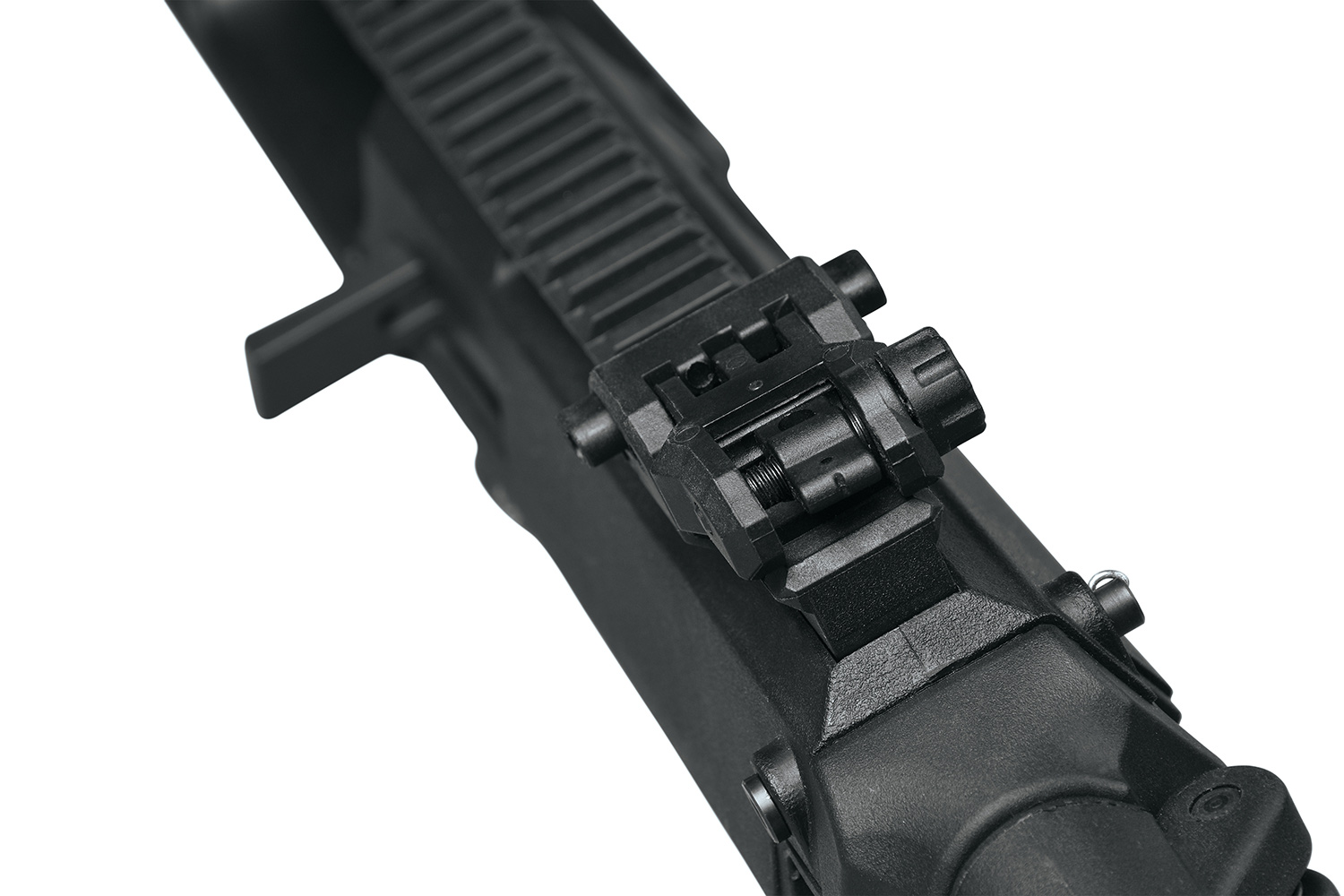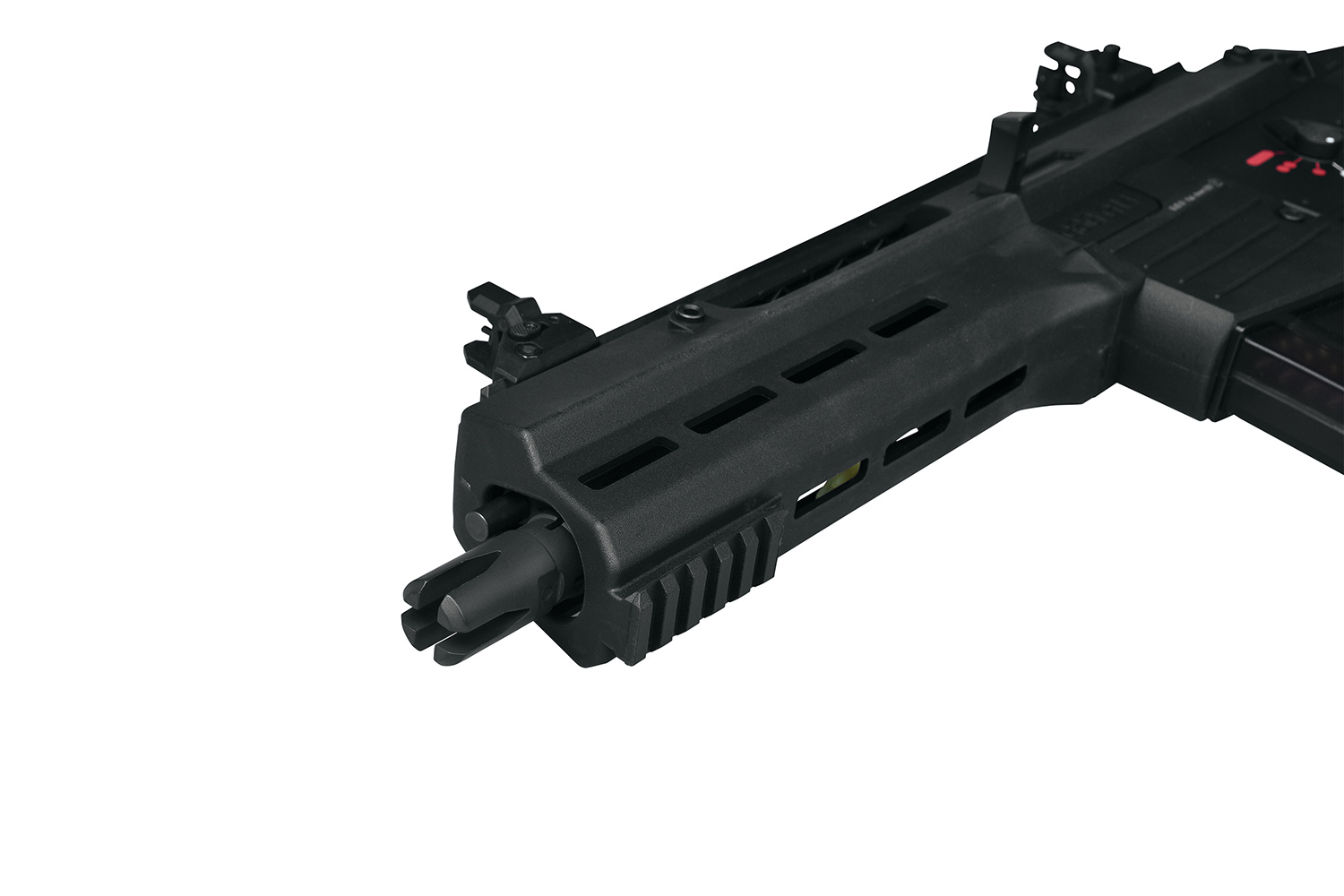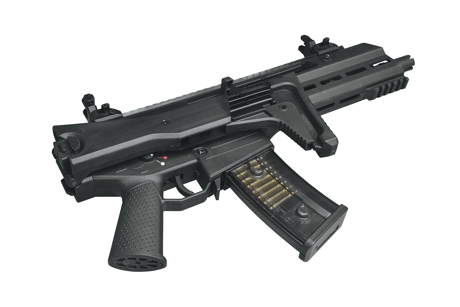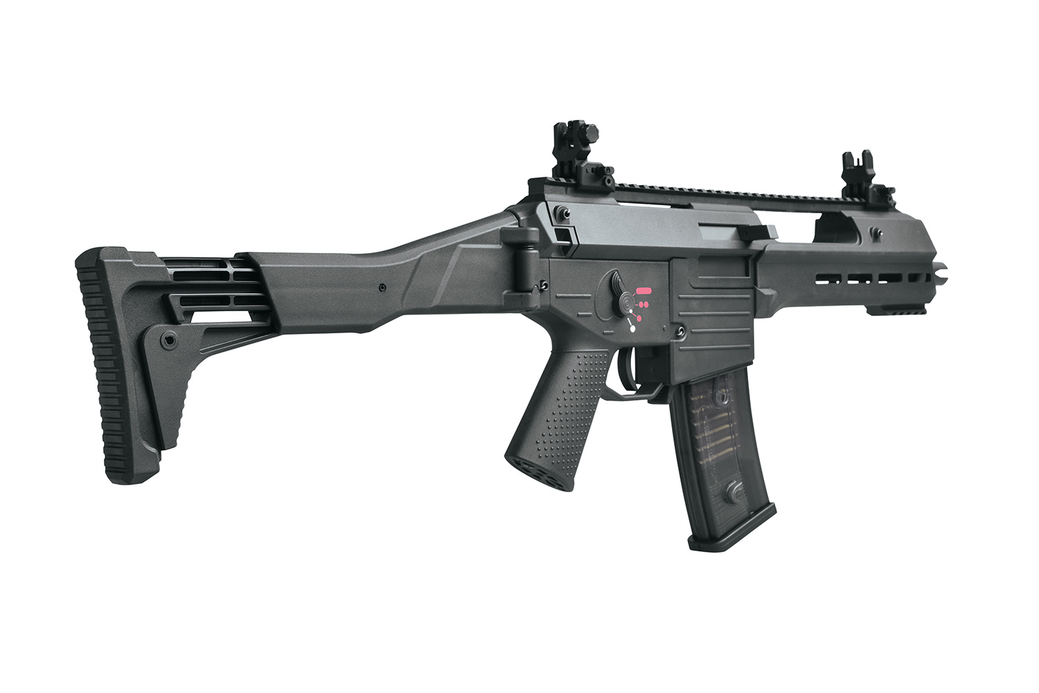 Die Electronic Blow-Back Funktion 'Real Power' sorgt durch eine doppelte Federung für einen starken, realistischen Rückstoß. Der neu designte Klappschaft mit verstellbarer Schulterstütze bietet maximalen Komfort. In Kombination mit dem Anti-Slip Griffstück erhältst du eine Waffe, die sich ausgezeichnet führen lässt. Du kannst die GSG 14 Carbine nach Belieben mit einem Silencer (14mm CCW) oder auch anderem verschiedenen Zubehör, dass du z.B. auf der Picatinnyschiene anbringen kannst, ausstatten. Die Flip-Up-Visierungen stellen sich per Knopfdruck auf.