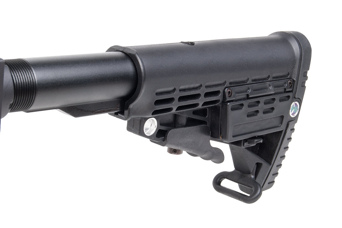 Dieverse Railschienen, unter anderem am Klappschaft, erlauben die Montage verschiedenster Anbauteile. Der Klappschaft bietet zusätzlich ein praktisches Aufbewahrungsfach.