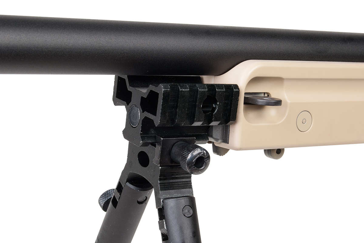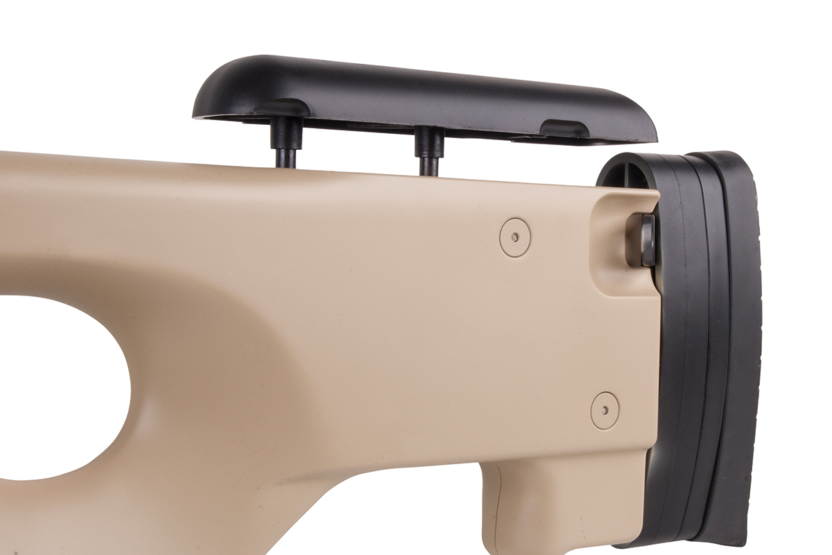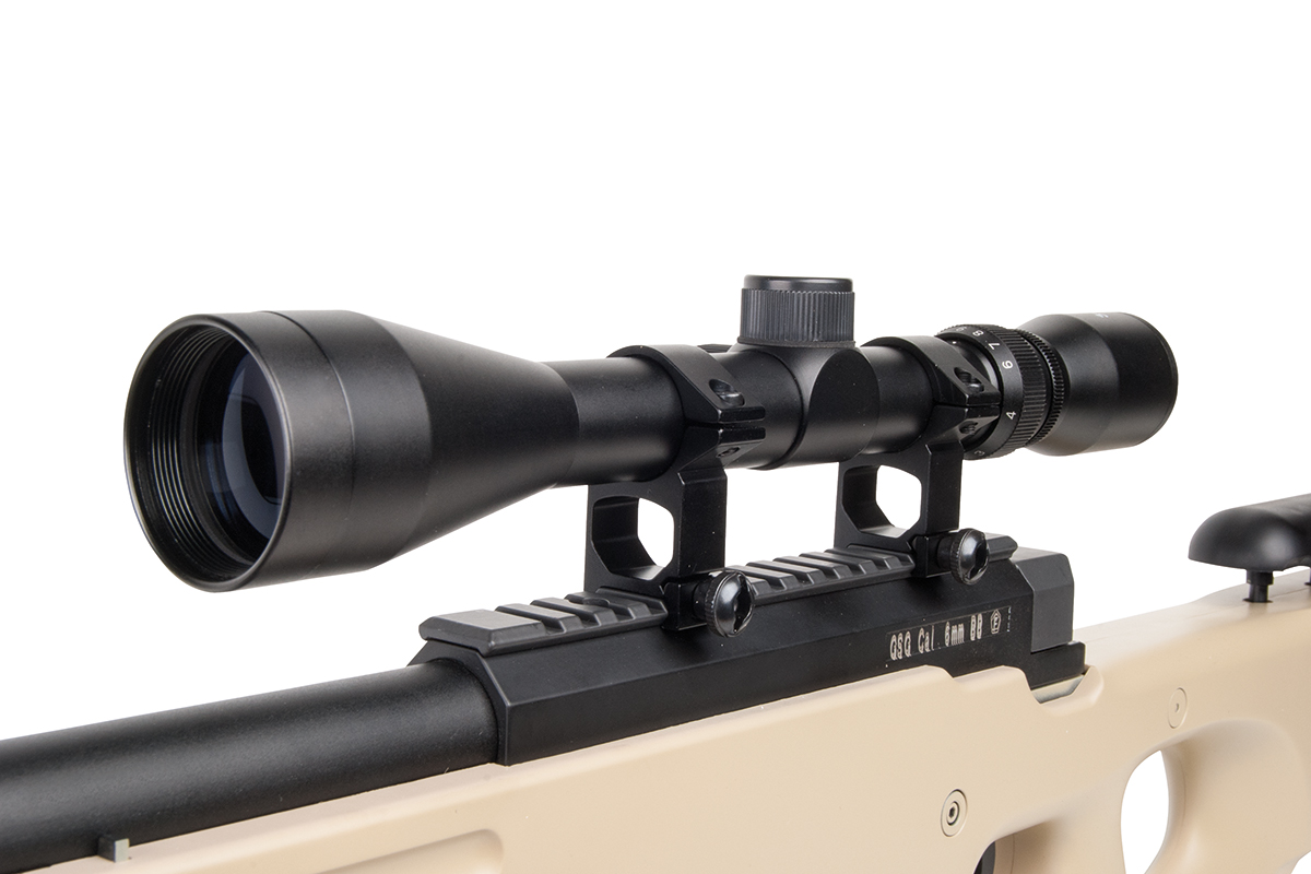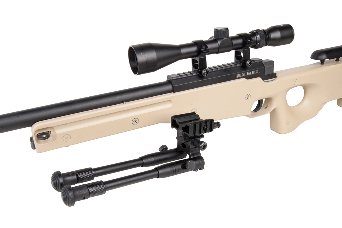 Der sehr gelungene Nachbau mit Federdrucksystem und einer Energie von ca. 1,8 Joule verfügt über einen festen Lochschaft, ein abnehmbares Zweibein, ein hochwertiges Zielfernrohr 3-9x40, eine verstellbare Wangenauflage und eine Railschienn.