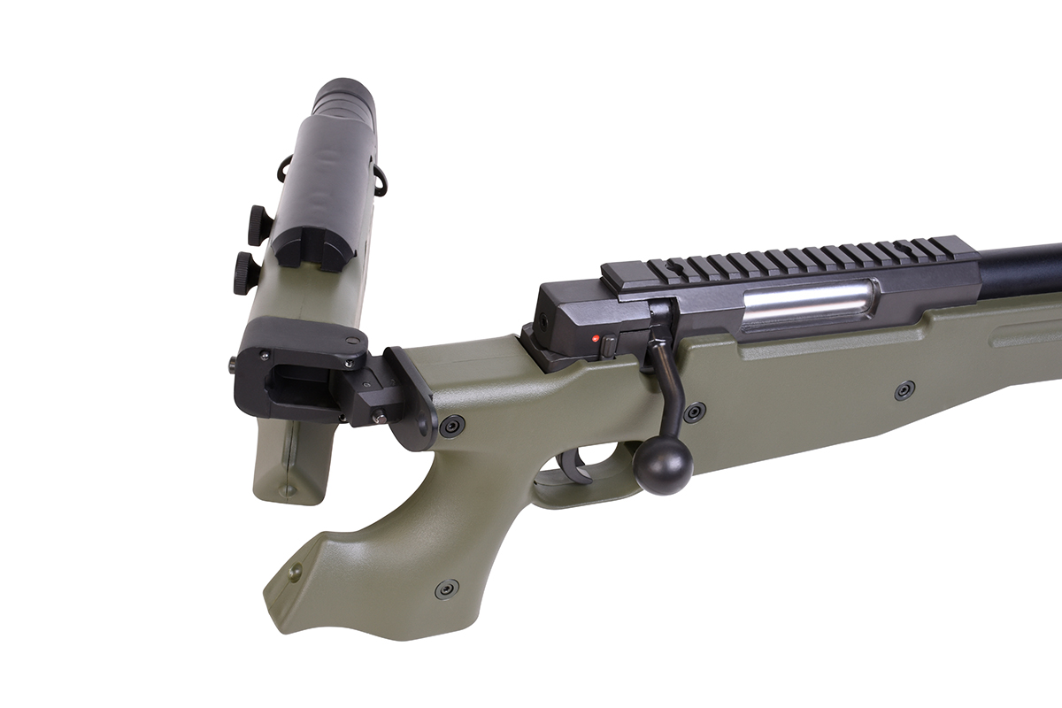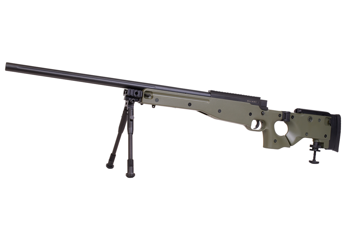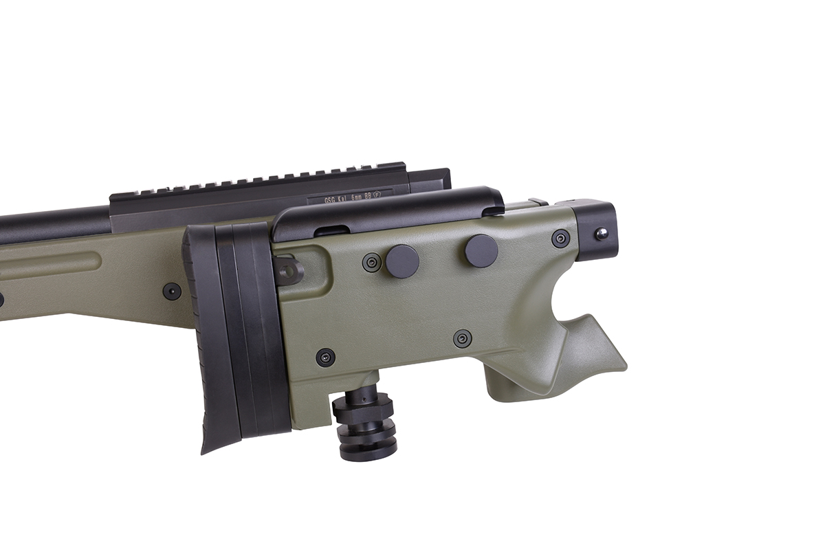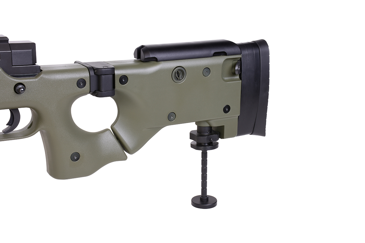 Der sehr gelungene Nachbau mit Federdrucksystem und einer Energie von ca. 1,7 Joule verfügt über einen einstellbare Schulterstütze, einen Klappschaft, eine Railschiene, eine verstellbare Wangenauflage, eine Abzugssicherung, einen einstellbaren Erddorn und das bewährte Spin-Up System für Präzision auf höchstem Niveau.