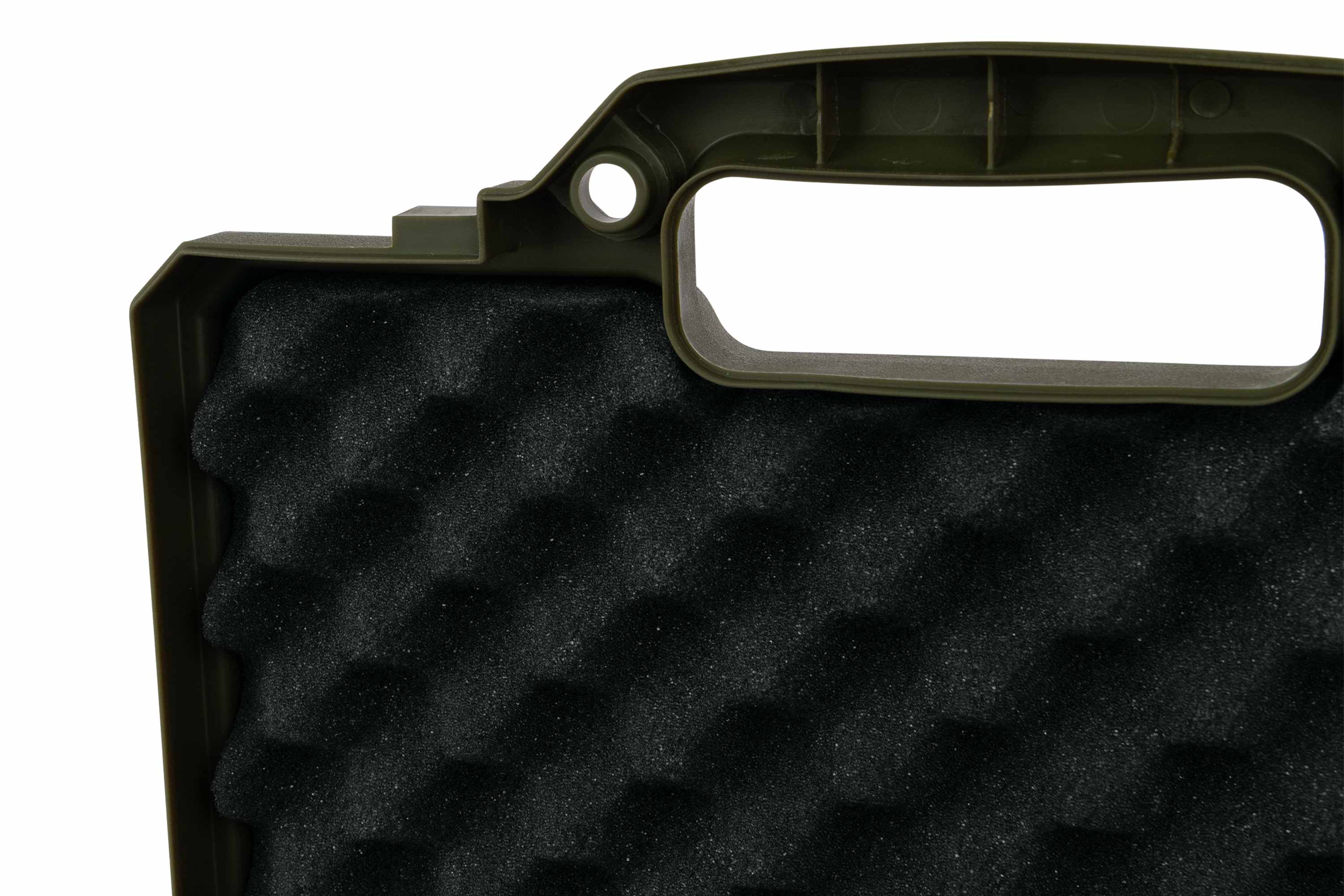 Im Inneren sorgen Schaumstoffeinlagen für optimalen Schutz. Der Deckel ist mit Noppenschaum (Eggshell) ausgestattet, während der Boden über Pick-&-Pluck Schaumstoff verfügt. So kannst du den Innenraum individuell an deine Pistole oder dein Zubehör anpassen und alles sicher fixieren.