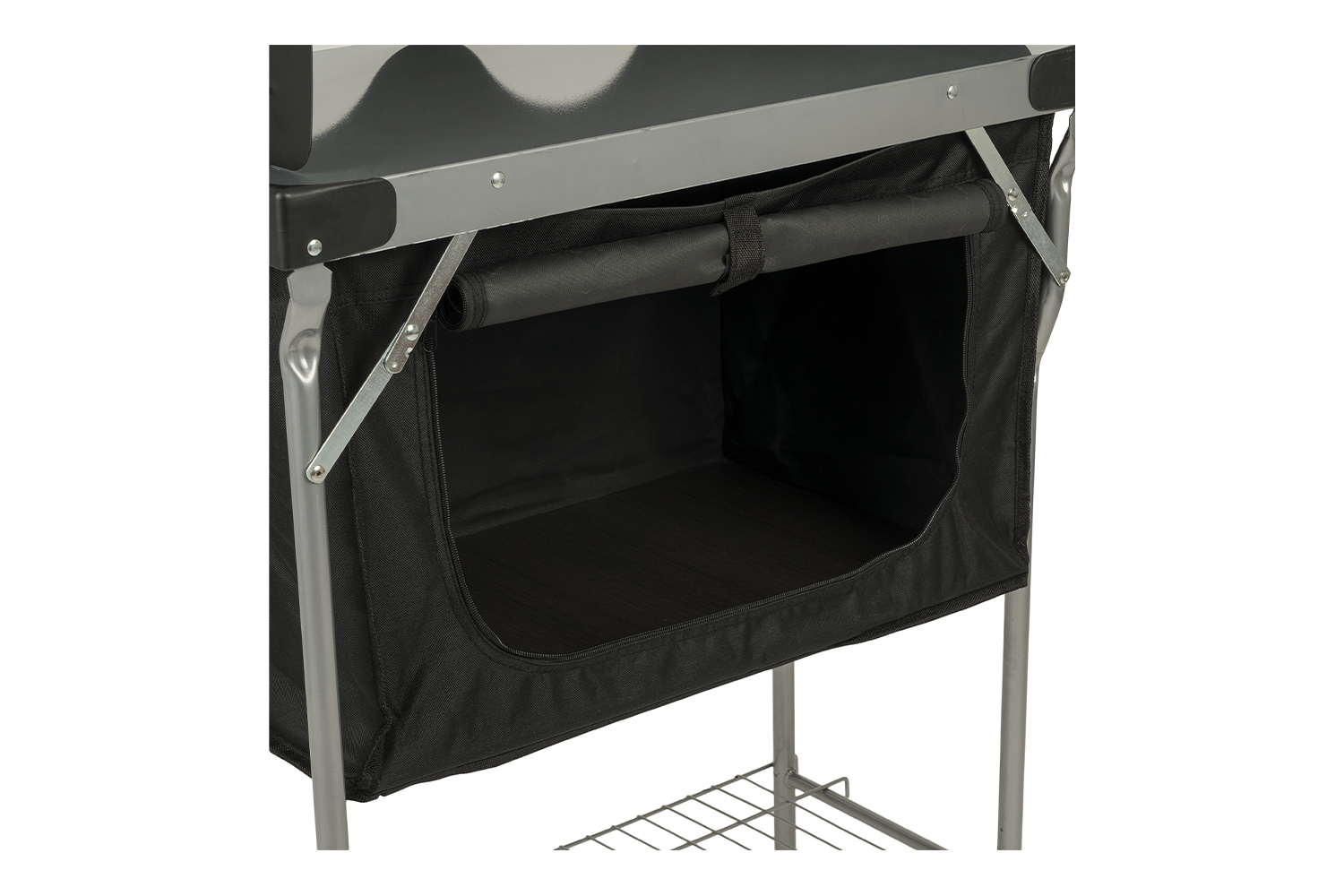 Der integrierte Camping Küchenschrank mit Ablagefach schafft Ordnung und schnellen Zugriff auf Lebensmittel, Kochutensilien und Zubehör. Zusätzliche Ablageflächen erweitern den Stauraum sinnvoll.