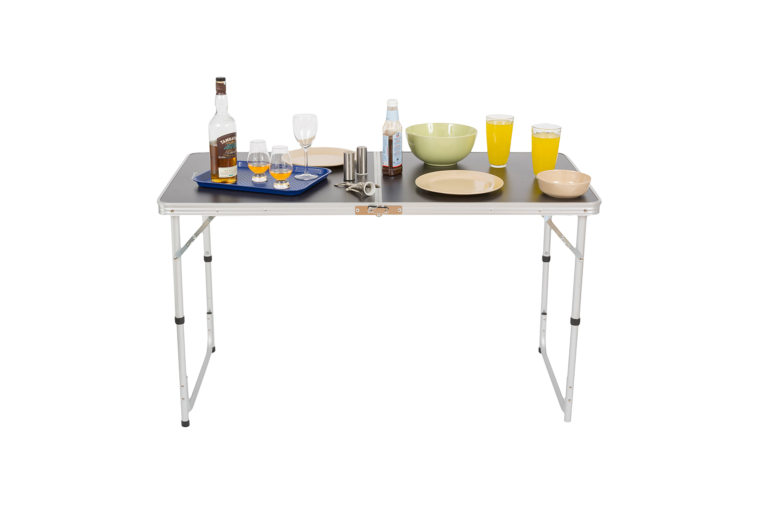 Dank der mittigen Faltfunktion lässt sich der Camping Klapptisch wie ein Koffer zusammenklappen und platzsparend verstauen. Der integrierte Tragegriff erleichtert den Transport zusätzlich.