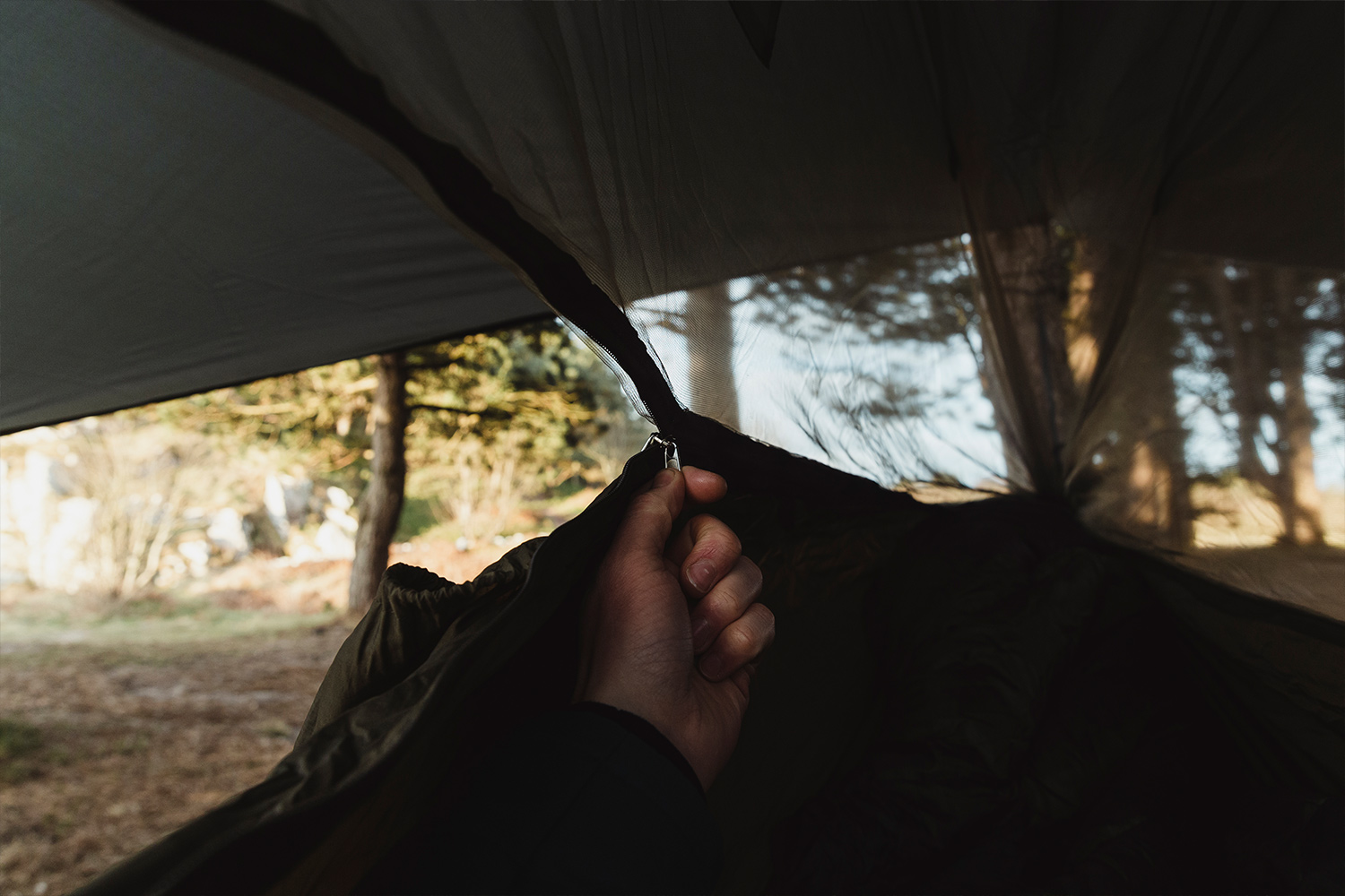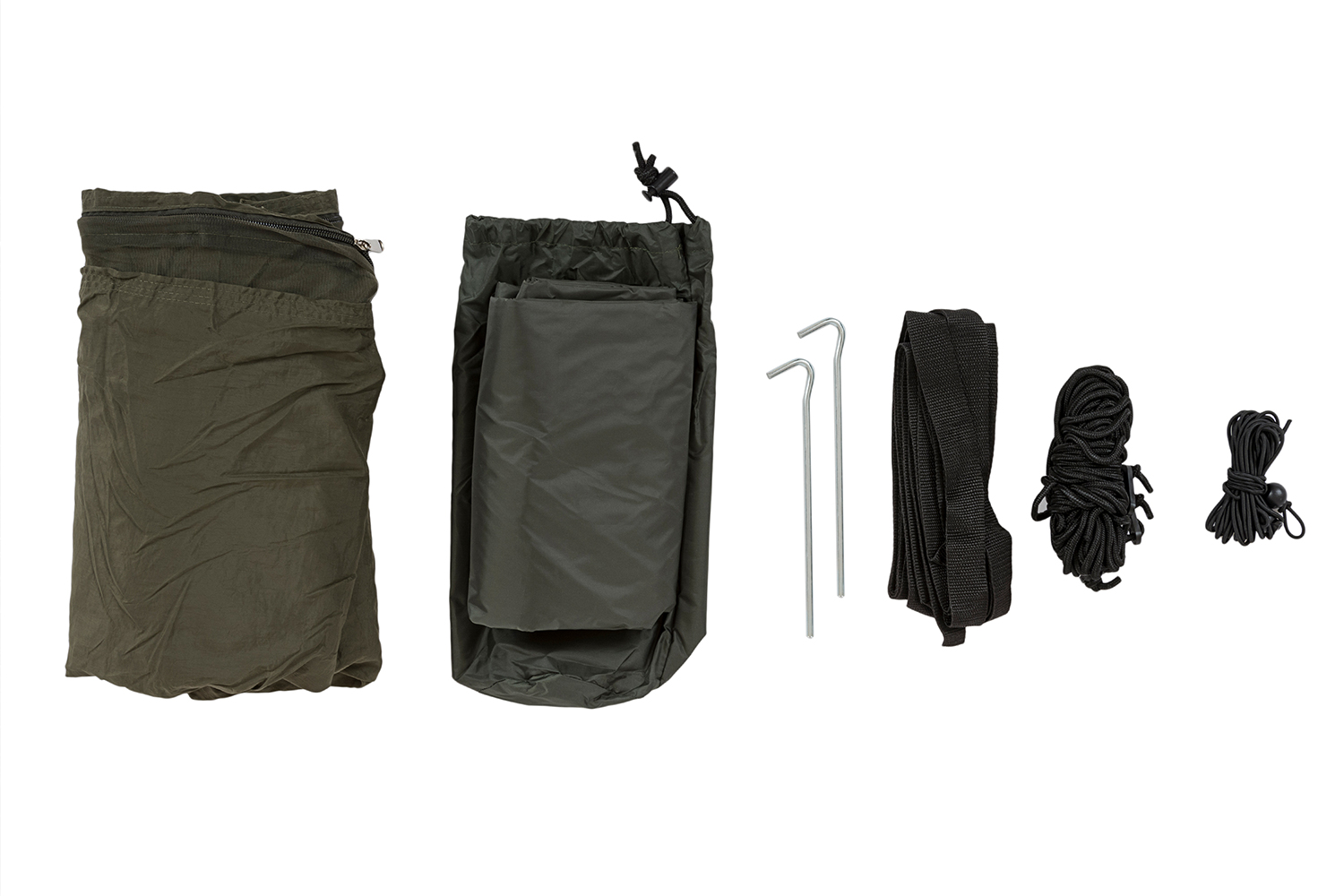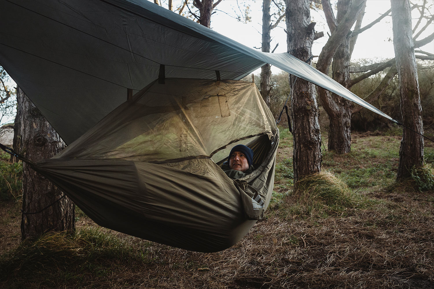 Die Hängematte besteht aus strapazierfähigem Polyamid, während Netz, Tarp und Abspannleinen aus robustem Polyester gefertigt sind. Die stabile Konstruktion sorgt für Zuverlässigkeit auch bei intensiver Nutzung.