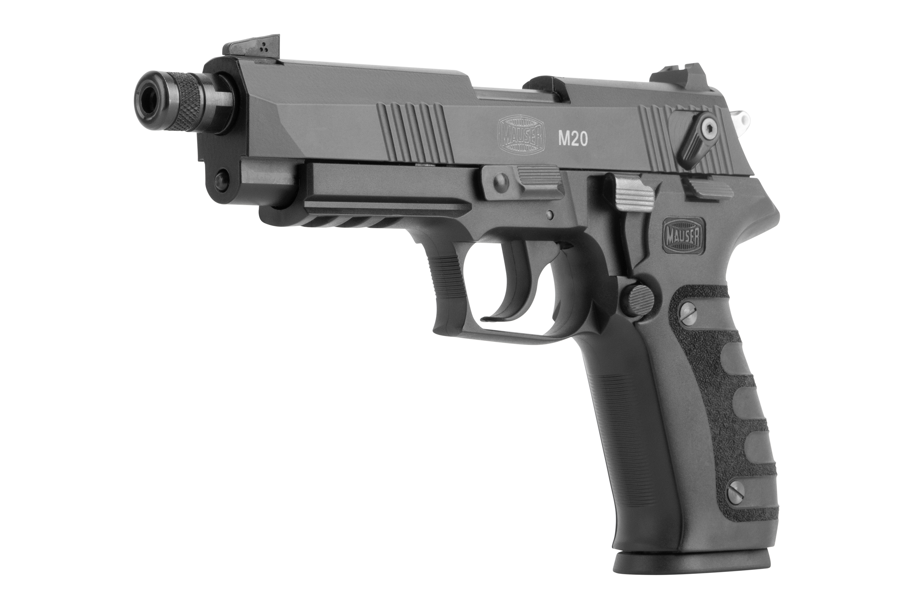 Die Mauser M20 ist eine um 10% verkleinerte Selbstladepistole im Design einer SIG SAUER P226 im Kaliber .22lr mit gleichem System und gleichen Sicherheitsfunktionen. Lediglich im Verschluss unterscheidet Sie sich vom großen Bruder, hier arbeitet ein Masseverschluss (Blowback-System).