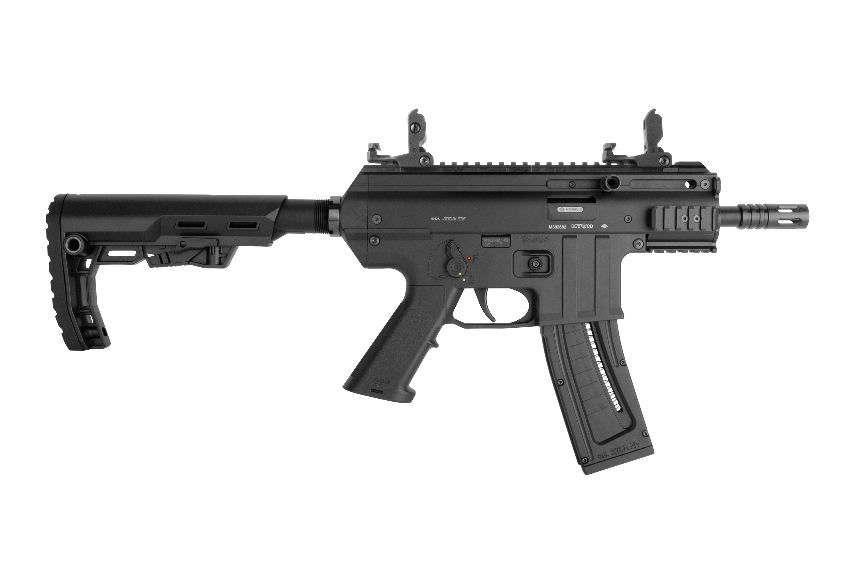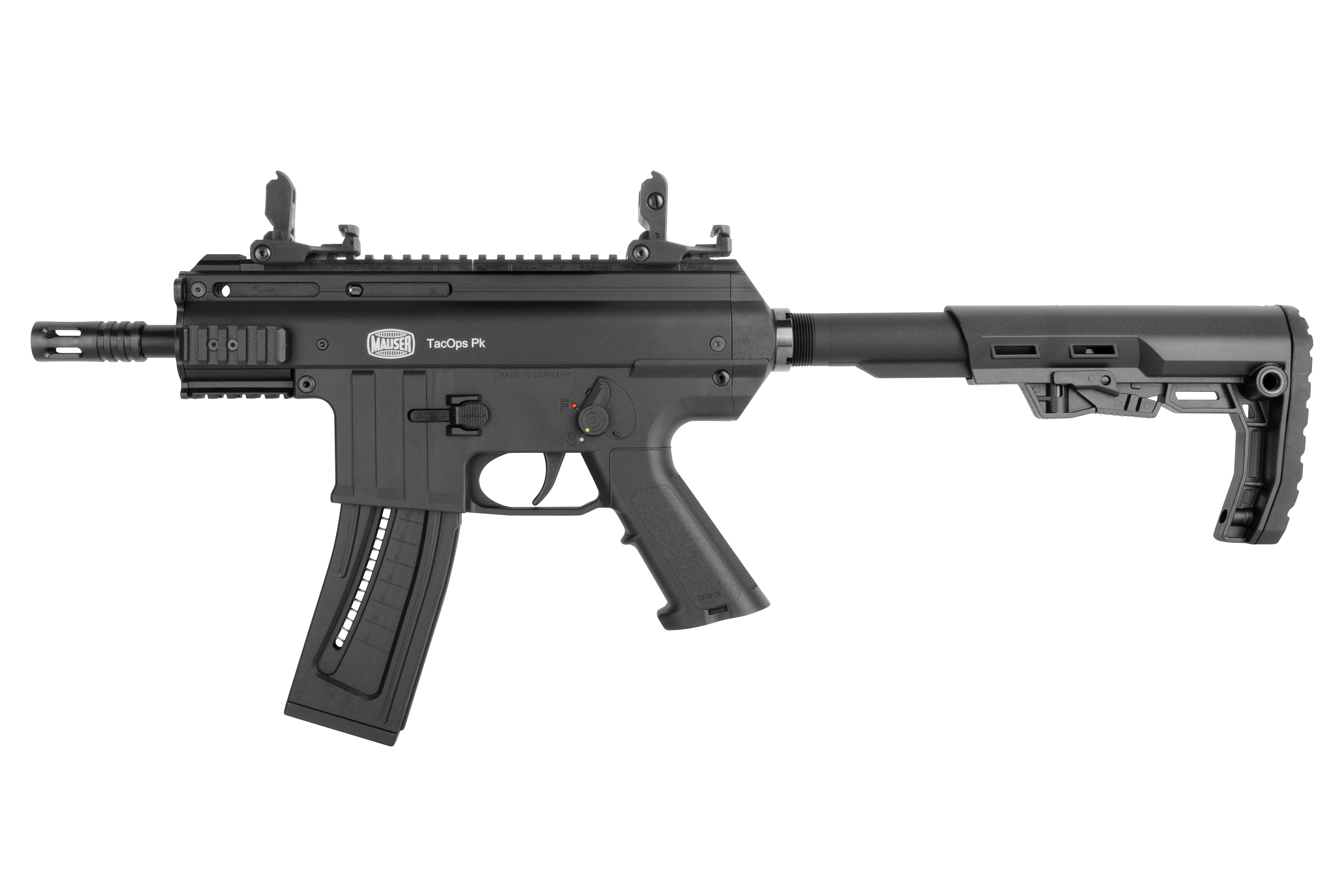 Der MIL-SPEC Schiebeschaft ist für einen optimalen Sitz in 5 Position verstellbar. Auch das Zielen mit der Mauser TacOps erfolgt blitzschnell über die abnehmbare Flip-Up Visierung. Auf der Picatinnyschiene an der Oberseite kannst du nach Belieben auch eine andere Visierung, wie z.B. ein Red Dot Visier oder ein Zielfernrohr aufsetzen. Unter dem Vorderschaft der Mauser TacOps PK ist ebenfalls eine Picatinny Schiene angebracht. Der Abzug ist zweistufig einstellbar.
