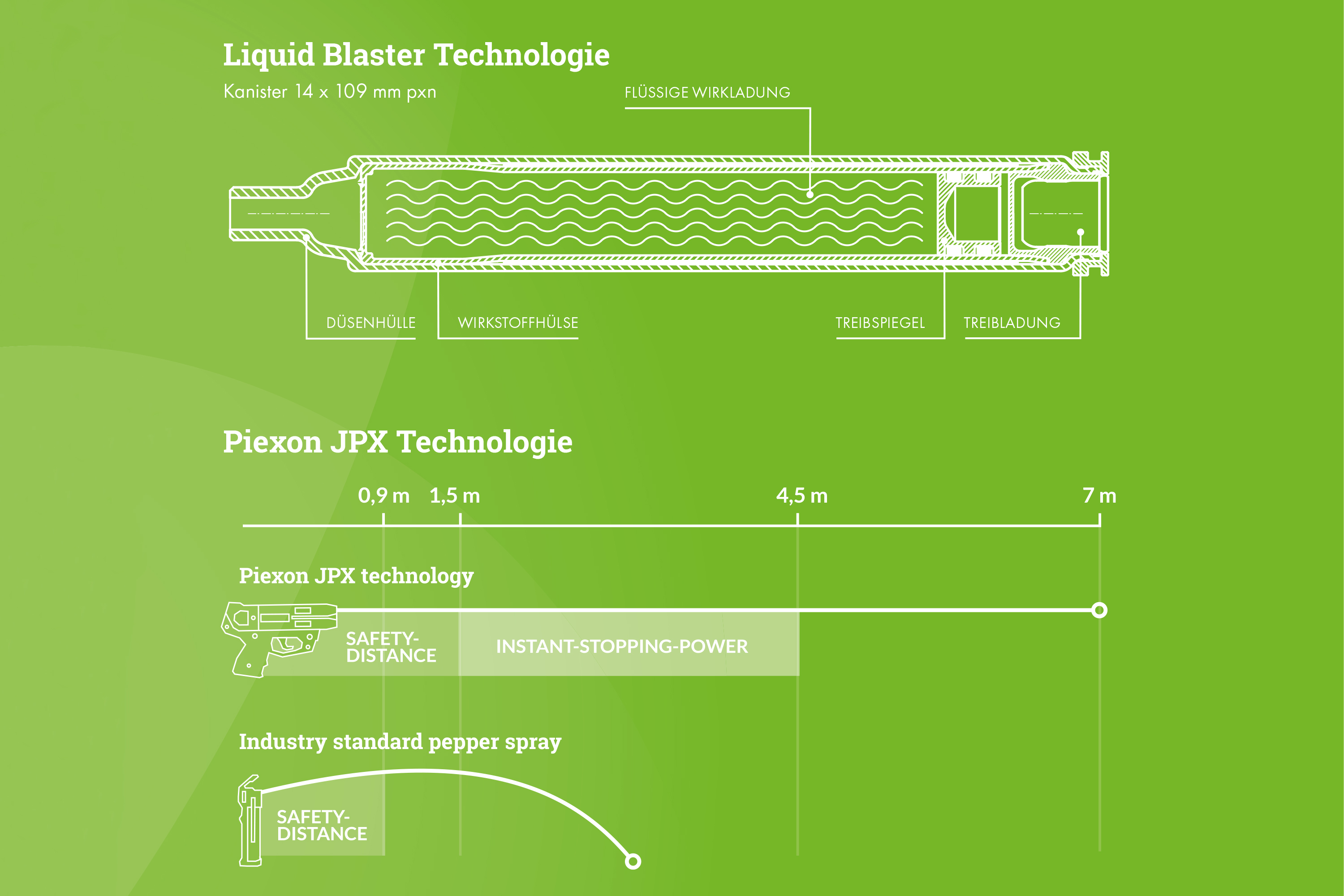 Der PIEXON JPX 6 mit Laser gibt ein starkes Tierabwehrspray ab, das auf Capsaicinoiden basiert. Der Reizstoff Oleoresin Capsicum wird in 10%iger Konzentration verwendet, was wesentlich wirkungsvoller als das stärkste Pfefferspray ist. Die Alternative zu Pfefferspray verteilt das Abwehrmittel nicht in Form eines Sprühnebels, sondern durch ein spezielles Treibgasdrucksystem mit hoher abgefeuert. Während normales Pfeffer Spray oft anfällig für Wind und Streuung ist, wird das Hundeabwehrspray des PIEXON JPX 6 mit Laser in Form eines konzentrierten Strahls mit hoher Geschwindigkeit abgefeuert. Dies erhöht die Reichweite und Genauigkeit und verringert die Gefahr von Streuung und Kollateralschäden. Außerdem kann der PIEXON JPX6 auch bei Regen verwendet werden.