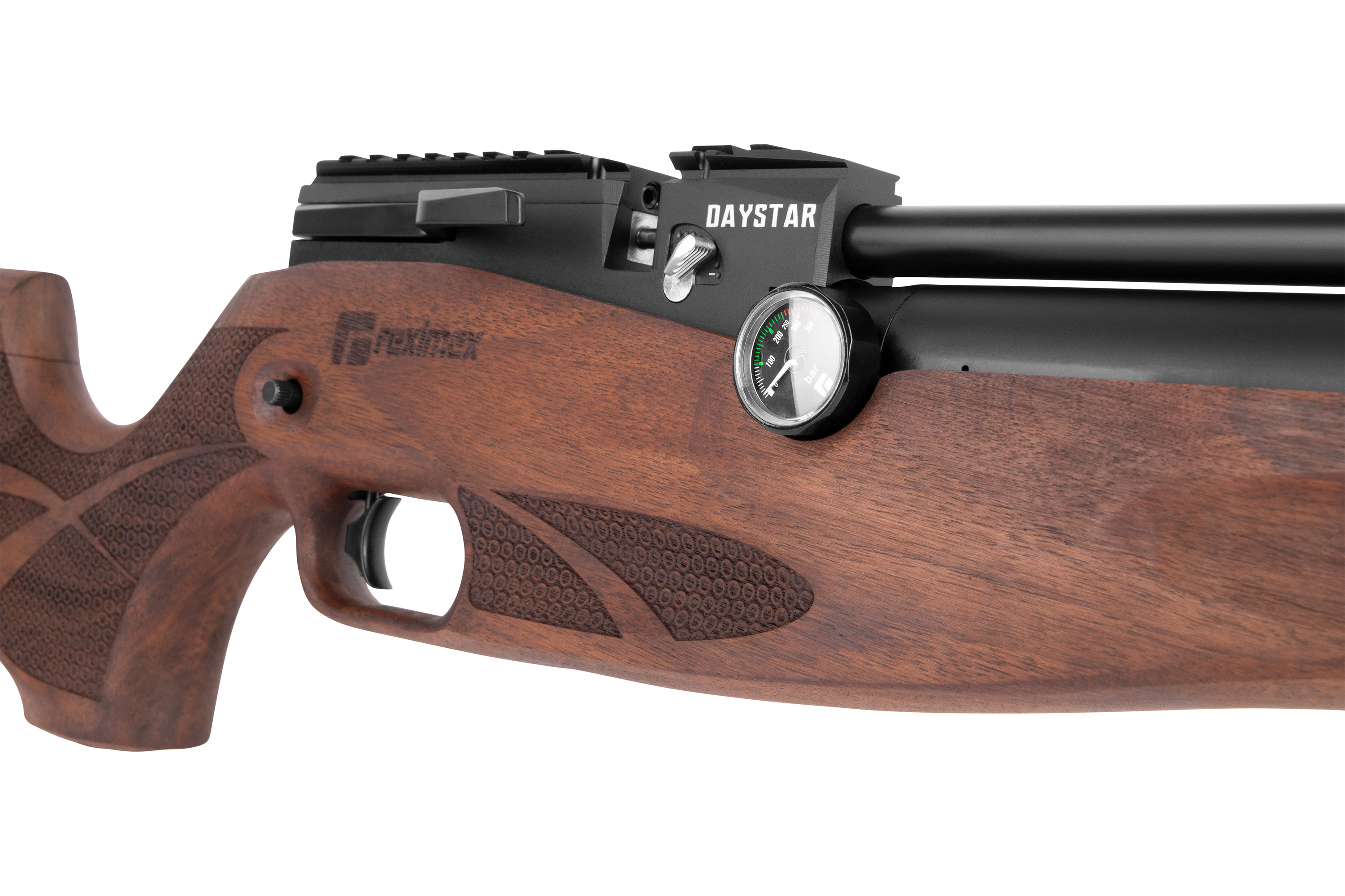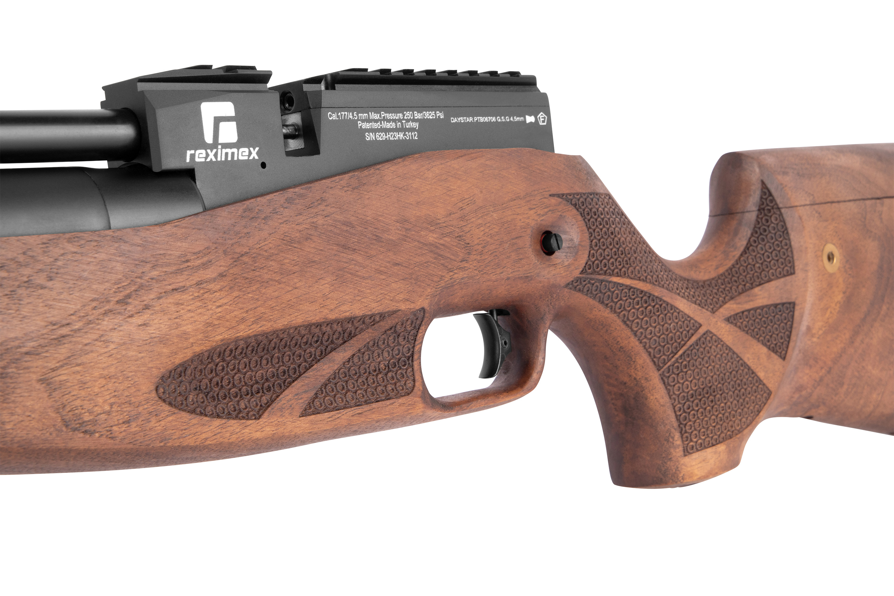 Das PCP Gewehr bietet dir einen ergonomisch designten, extrem hochwertigen Walnuss Echtholzschaft. Dieser verleiht dem Reximex Daystar ein angenehmes Gewicht und gewährleistet Komfort und Stabilität während des Schießens. Die Schaftkappe ist gummiert und kann bei Bedarf vertikal verstellt werden. Die Griffoberfläche ist texturiert, um einen sicheren und komfortablen Halt zu gewährleisten, während die einstellbare Schaftbacke und der einstellbare Abzug eine perfekte Anpassung an deine individuellen Bedürfnisse schaffen. Auf der Montageschiene oben auf der Druckluft Waffe kannst du sowohl eine Visierung, wie ein Zielfernrohr oder Red Dot Visier, mit 11mm als auch eine Optik für 22mm Picatinny anbringen. An Vorderschaft und Hinterschaft ermöglicht je ein Sling Mount das Tragen mit einem Tragegurt.
