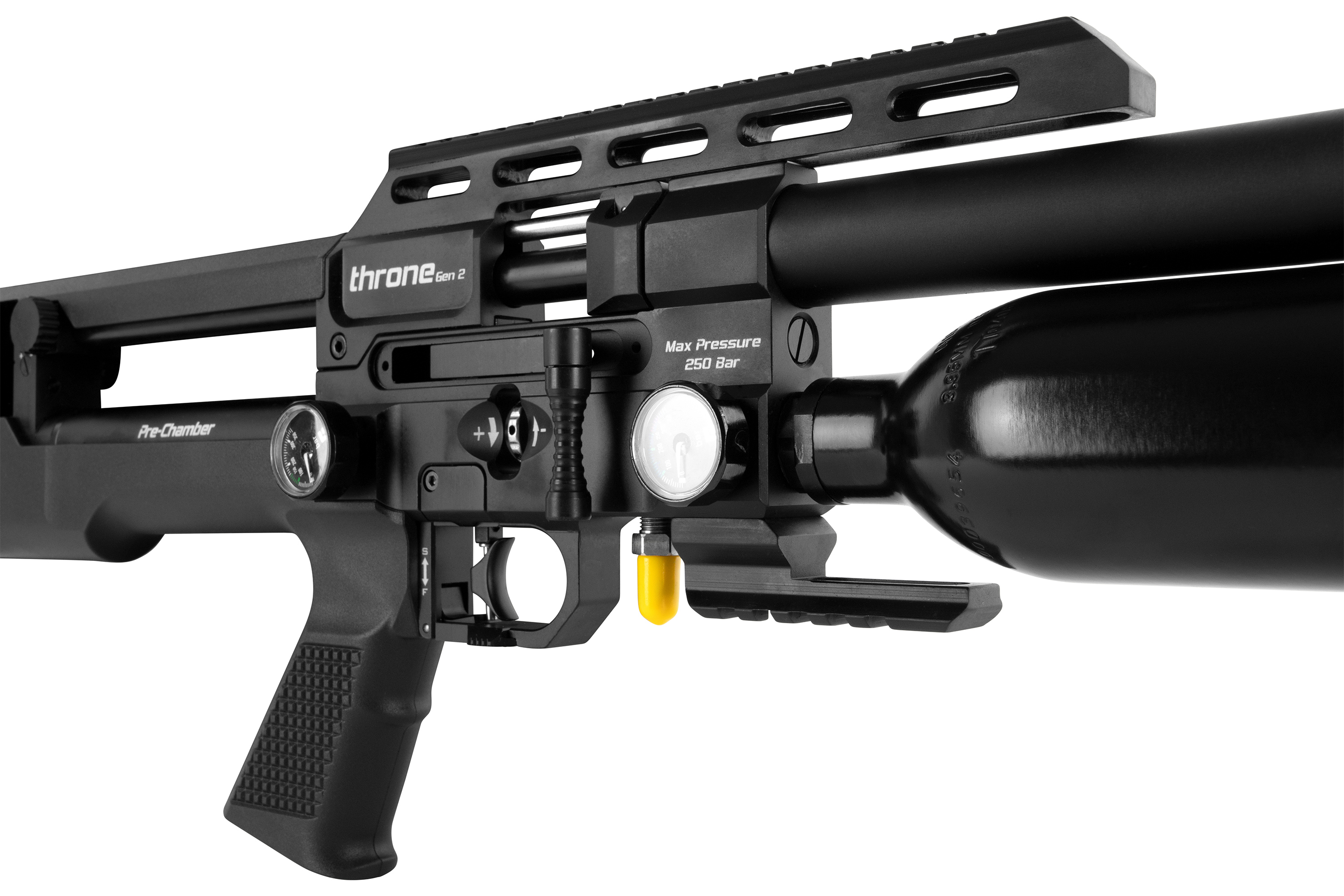 Der Presslufttank kann mit maximal 250 BAR gefüllt werden und fasst 425 ml. Dieser kann mit einem Druckluft Kompressor oder einer Handpumpe aufgefüllt werden. Die Lieferung erfolgt in einem hochwertigen Polymer Waffenkoffer.