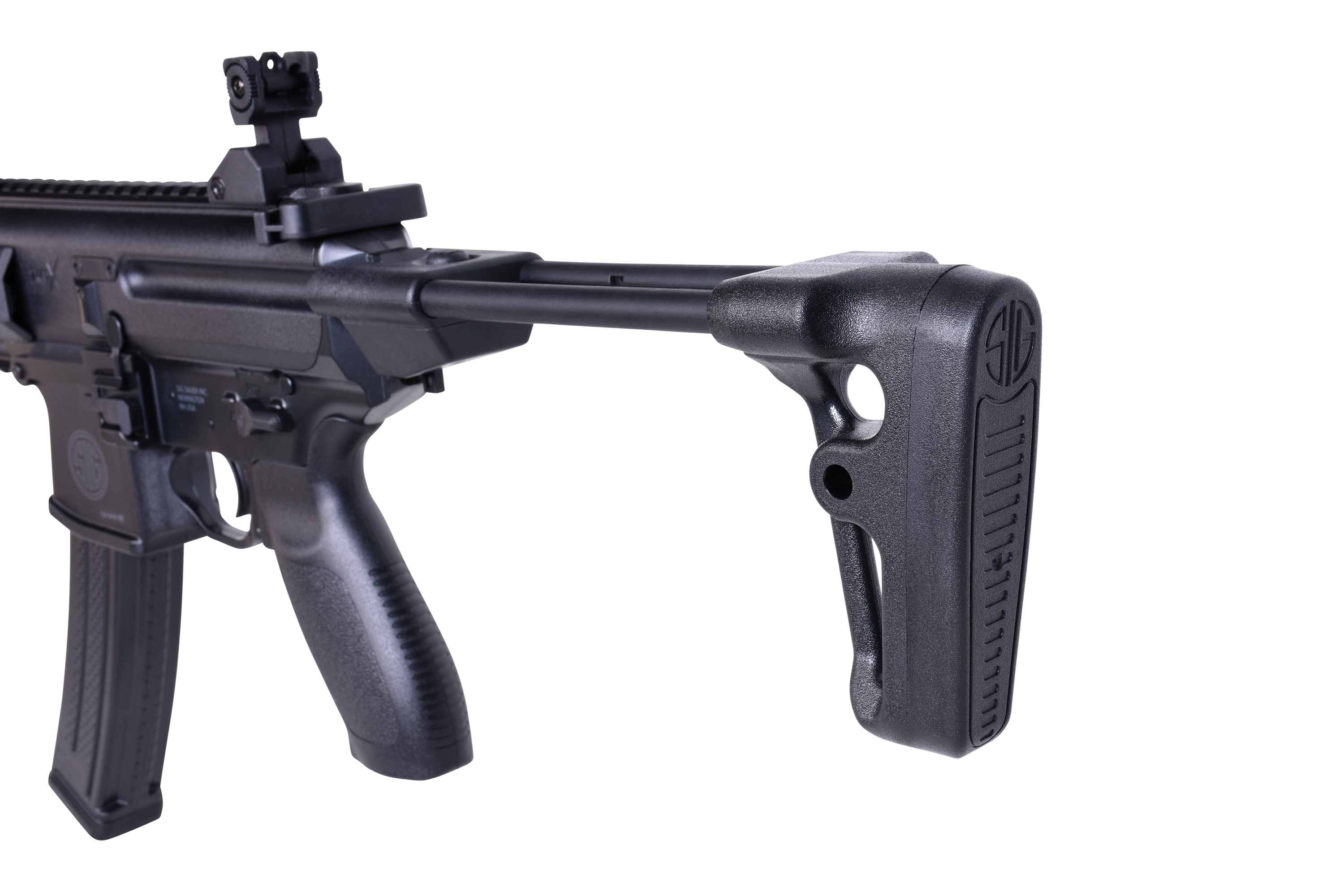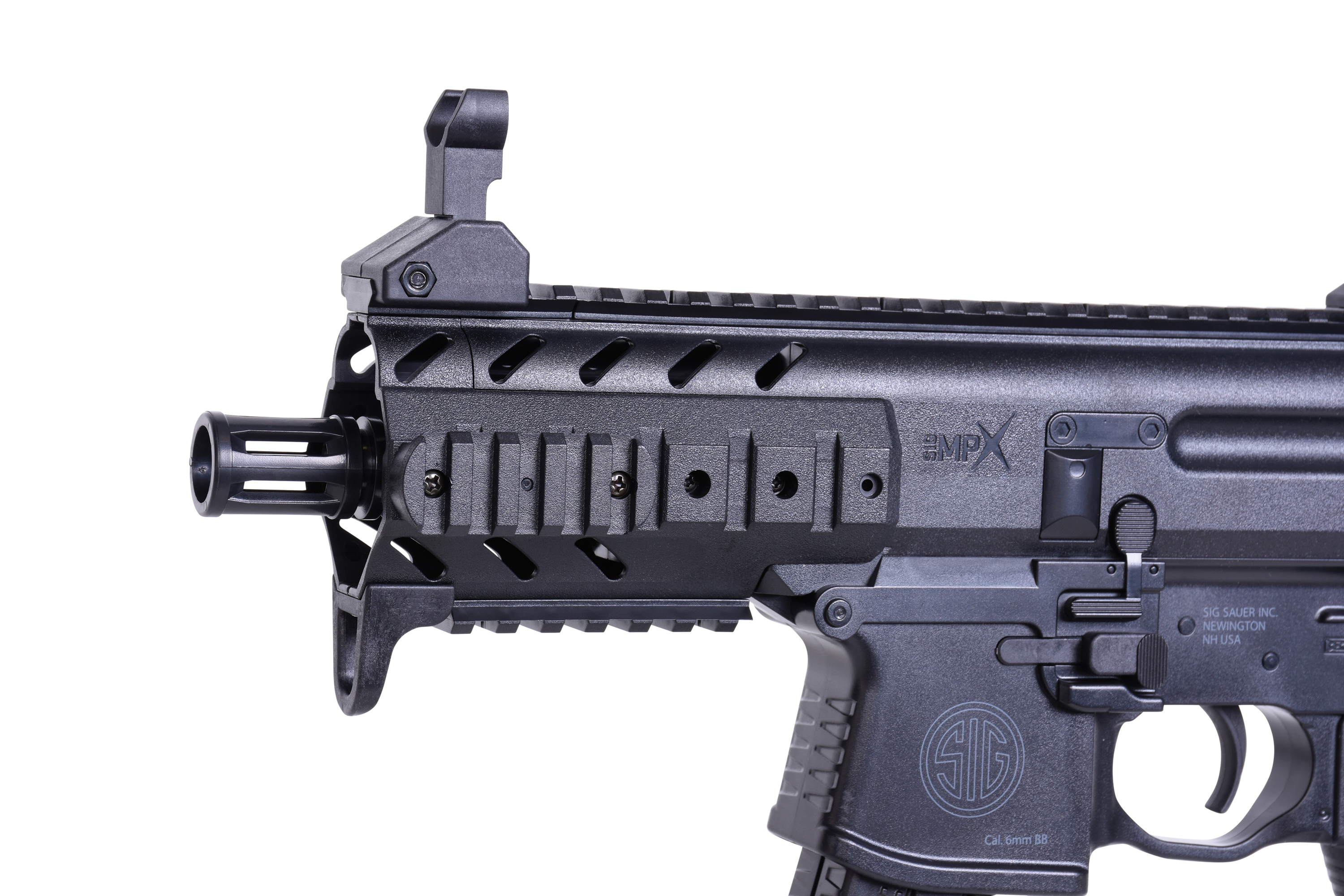 Im Inneren beider SIG SAUER Waffen ist ein festes Hop-Up-System verbaut, das in Kombination mit der Flip-Up-Visierung aus Kimme und Korn eine präzise Zielerfassung gewährleistet. Das kompakte Design des Softair Gewehrs beeindruckt nicht nur äußerlich, sondern bietet auch einen rutschfesten Pistolengriff, eine abnehmbare und dreifach verstellbare Schulterstütze sowie vier Picatinny-Schienen für die einfache Montage von Zubehör wie Red Dots oder anderen Optiken.